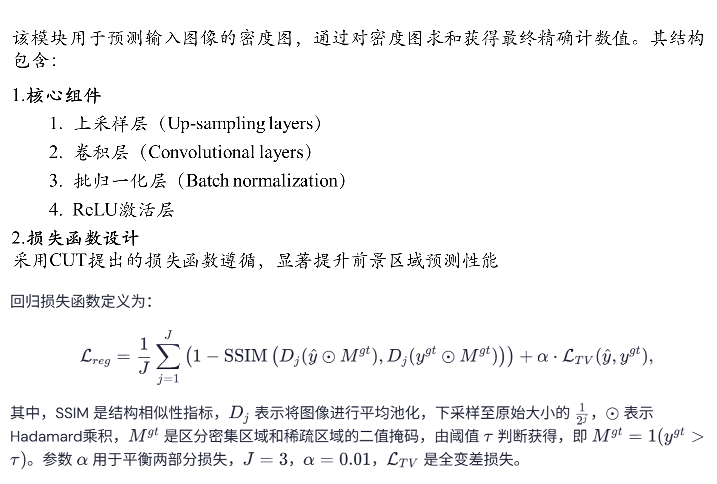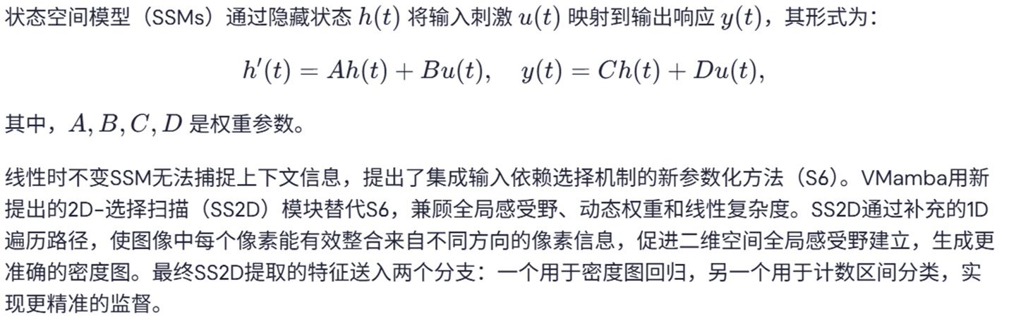 教师模型为未标注数据(包括修复图像)生成伪标签,学生模型则对标注数据及经过强增强的未标注数据(包含修复图像)进行预测。 TMTB方法整体框架基于半监督学习领域广泛采用的Mean Teacher架构构建。教师模型与学生模型结构一致,其权重通过指数移动平均(EMA)策略根据学生模型权重进行更新。方法采用新型VSSM模型VMamba作为主干网络,替代传统CNN与Transformer架构。VMamba提取的图像特征将输入两个独立分支:用于预测图像密度图的计数分支,以及预测预定义计数区间索引的分类分支。