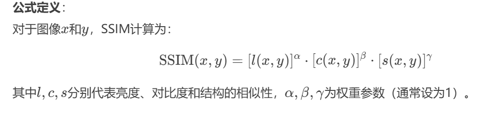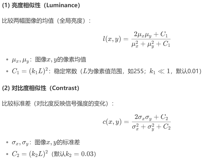 SSIM通过比较两幅图像在亮度(Luminance)、对比度(Contrast)和结构(Structure)三个方面的相似性,更符合人类视觉感知的评价指标。相比传统的MSE(均方误差),SSIM能更好地保留图像的结构信息。