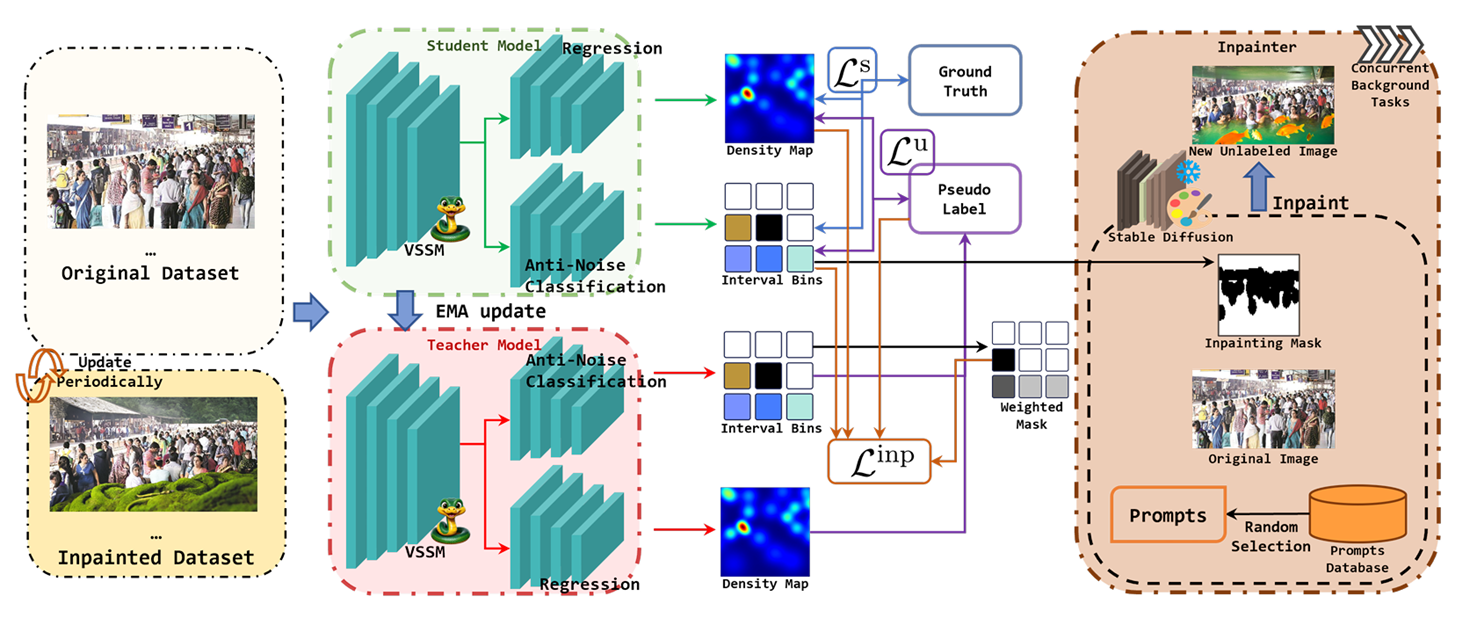 本文提出名为“Taste More ,Taste Better"(TMTB)的创新框架,该框架从数据和模型双重视角进行优化:首先,开发了专为人群计数任务设计的背景区域修复数据增强技术,该方法在保持场景真实性的同时显著提升数据多样性;其次,引入视觉状态空间模型作为主干网络,以捕捉人群场景的全局上下文信息——这对极端拥挤、低光照及恶劣天气场景尤为重要。除传统的精确回归头外,还创新性地采用抗噪分类头提供相对宽松但更可靠的监督信号,以缓解回归头对人工标注噪声敏感的问题。