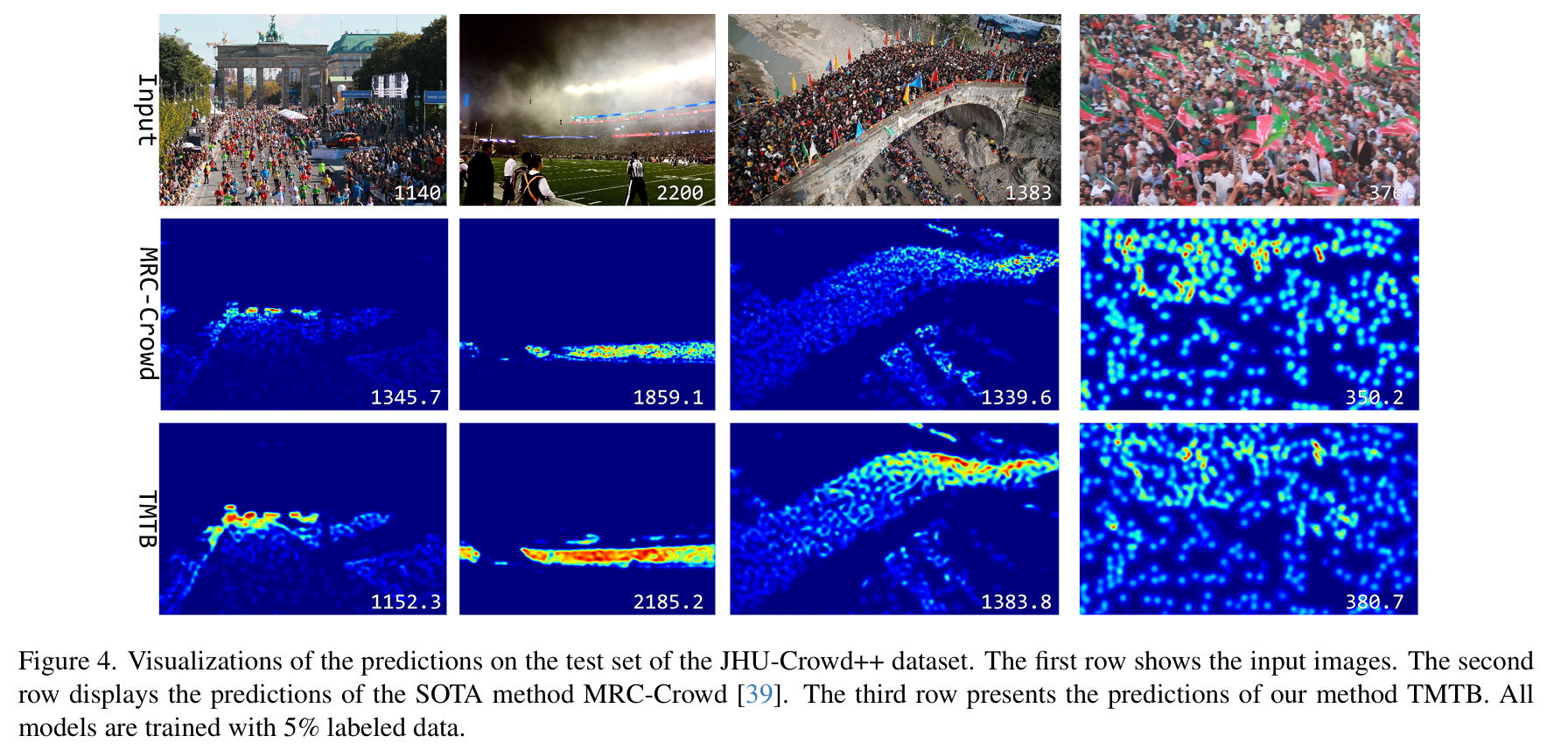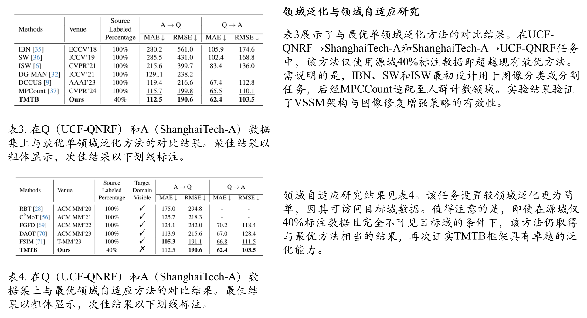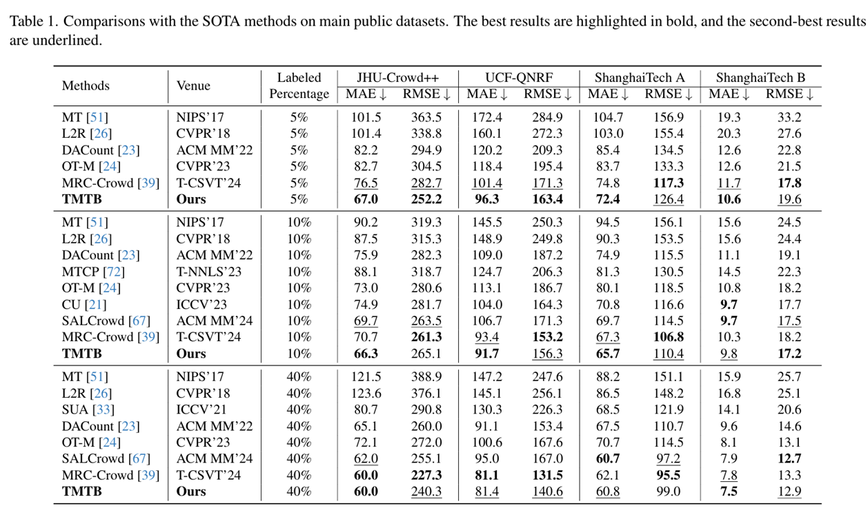 综合分析:仅使用5%有标注数据时,TMTB在JHU-Crowd++上取得最低平均绝对误差(MAE)67.0,在UCF-QNRF上为96.3,在ShanghaiTech A上为72.4,在ShanghaiTech B上为10.6,表现最佳。其在JHU-Crowd++上的结果不仅超过相同有标注数据量的最先进方法(SOTA),还表明在10%标注设置下TMTB仍具优势,凸显其高效利用标注数据和卓越准确性。10%有标注数据设置时,TMTB在JHU-Crowd++上MAE为66.3,在UCF-QNRF上为91.7,在ShanghaiTech A上为65.7,进一步展现泛化能力和有效性。40%有标注数据时,TMTB取得有竞争力结果,在JHU-Crowd++上匹配最低MAE 60.0,在ShanghaiTech B上将MAE降至最低7.5,在其他数据集上也保持强劲性能。
