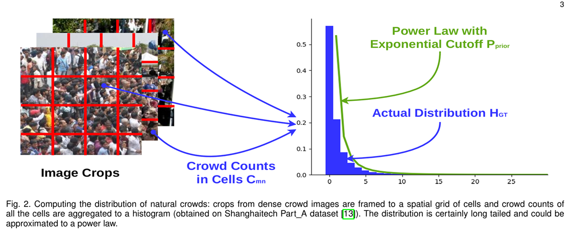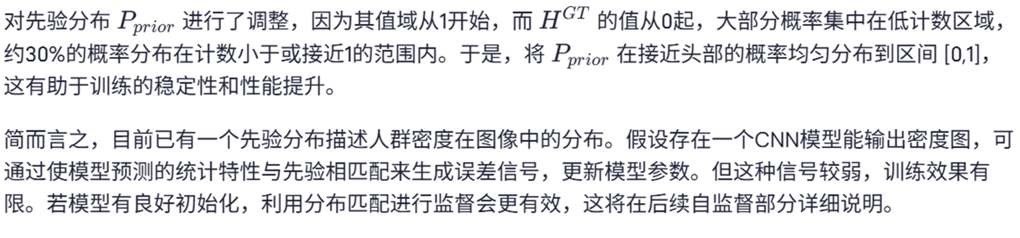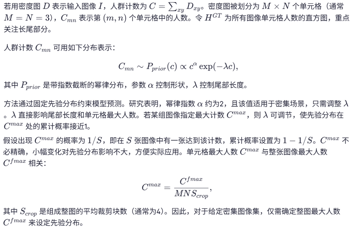 密集人群计数任务中训练无需标注数据的密度回归器存在固有挑战,主要原因在于缺乏引导模型进行密度估计的监督信号。可通过挖掘任务特定结构模式加以解决。针对密集人群图像的分析发现,其密度分布呈现显著的长尾特性。