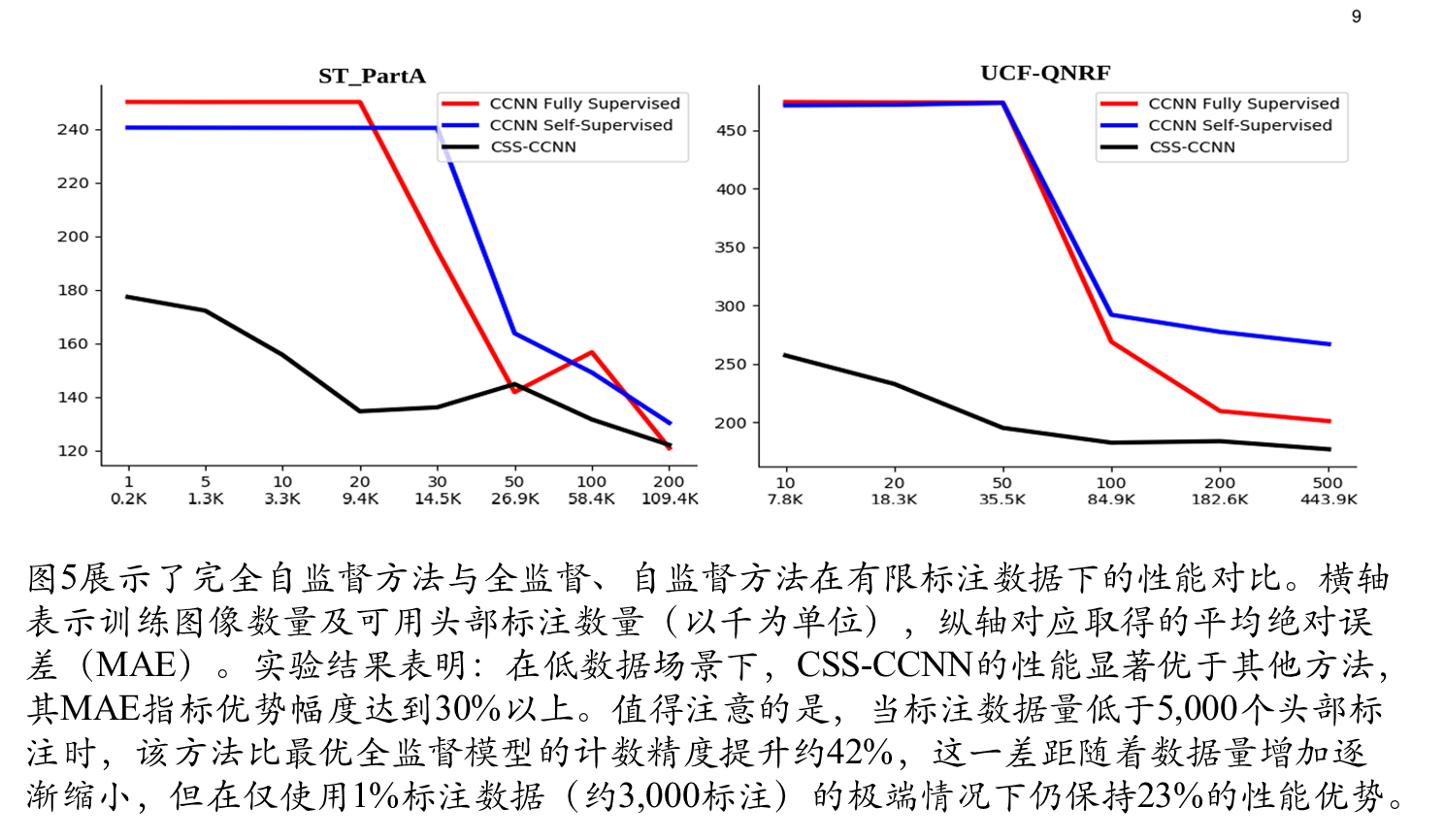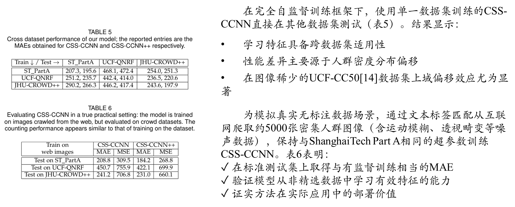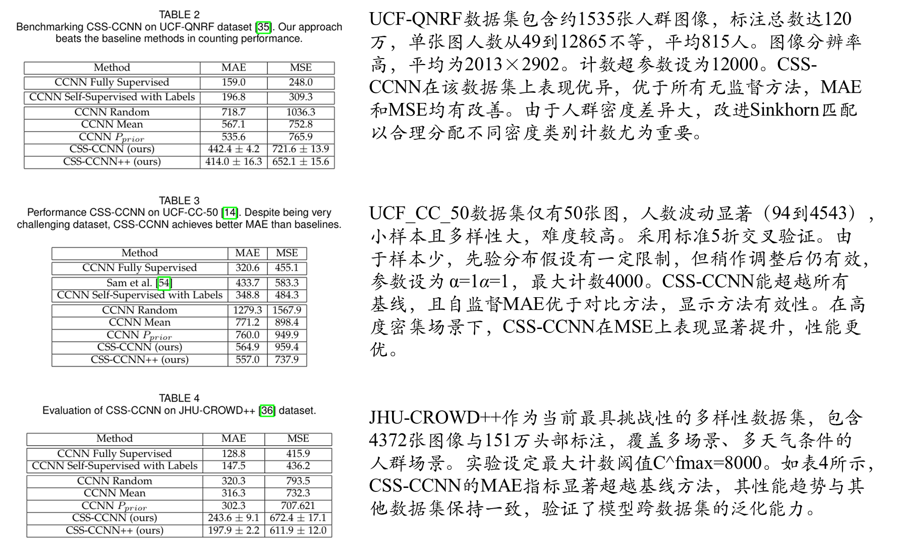 如表1所示,CSS-CCNN模型在三次独立实验(不同初始化条件下)中均显著优于所有基线方法,其平均性能指标及方差结果验证了方法的稳定性。相较于不考虑图像内容的简单策略,该方法展现出明显优势。改进后的CSS-CCNN++版本通过更精确的Sinkhorn匹配过程,将计数误差进一步降低约5%。值得注意的是,仅使用旋转自监督训练的CCNN网络性能已超越之前提出的模型。更引人注目的是,CSS-CCNN的计数精度(MAE指标)甚至优于早期部分全监督方法的性能水平。