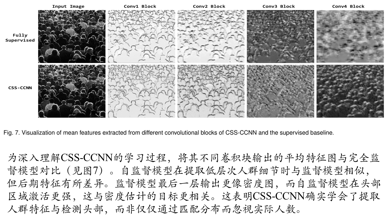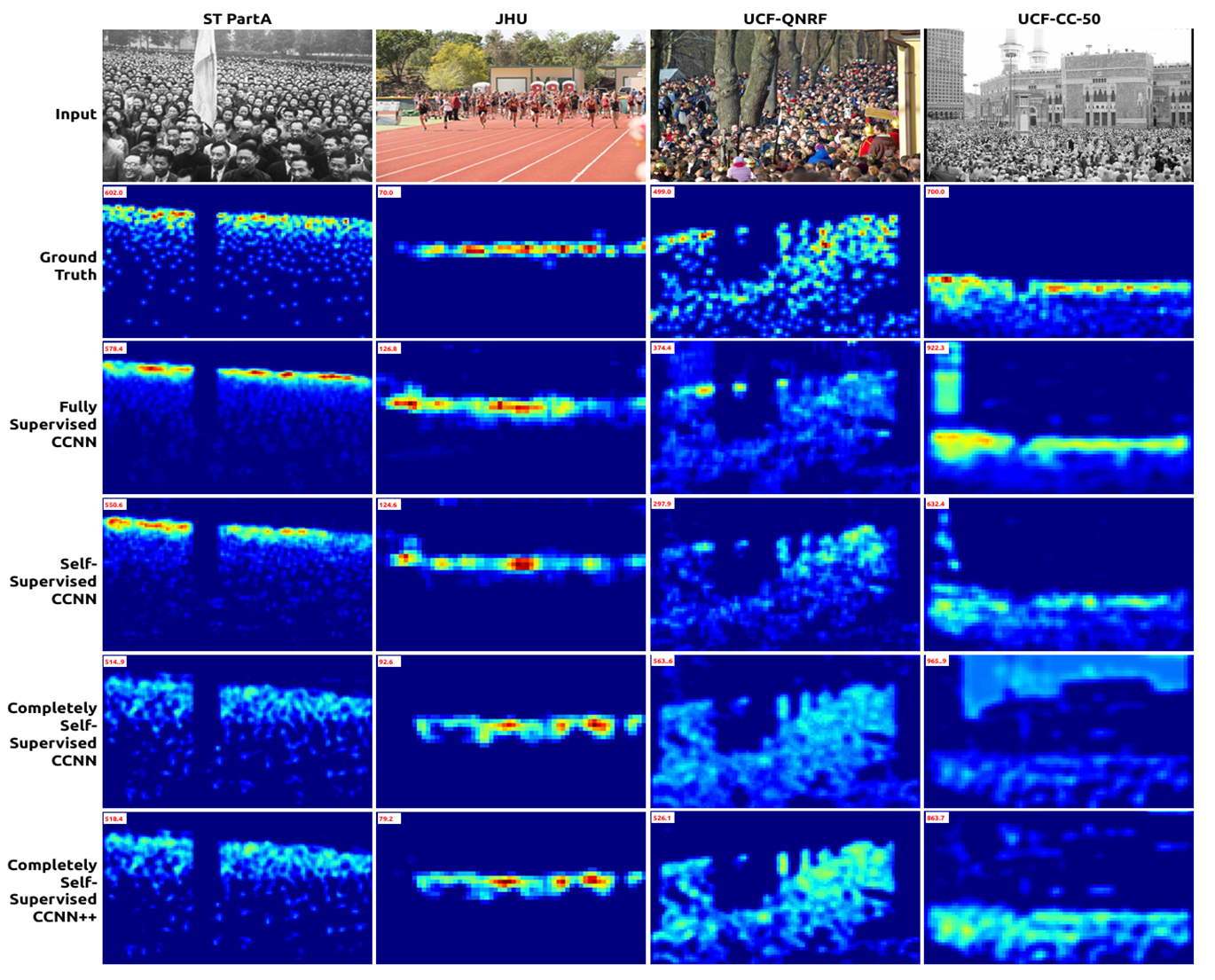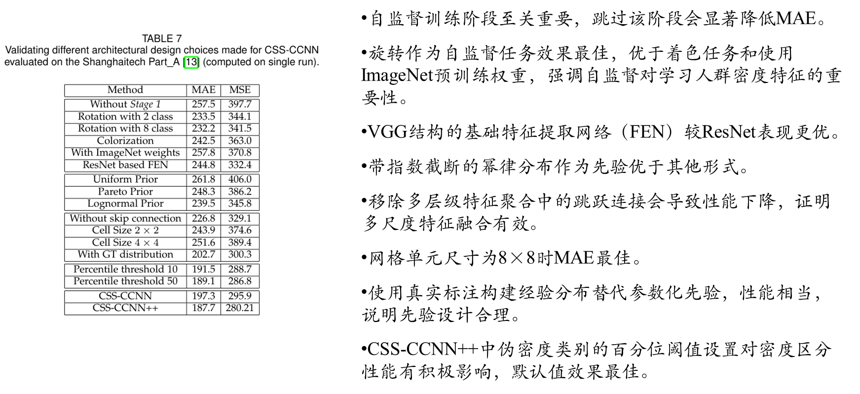 如表1所示,CSS-CCNN模型在三次独立实验(不同初始化条件下)中均显著优于所有基线方法,其平均性能指标及方差结果验证了方法的稳定性。相较于不考虑图像内容的简单策略,该方法展现出明显优势。改进后的CSS-CCNN++版本通过更精确的Sinkhorn匹配过程,将计数误差进一步降低约5%。值得注意的是,仅使用旋转自监督训练的CCNN网络性能已超越之前提出的模型。更引人注目的是,CSS-CCNN的计数精度(MAE指标)甚至优于早期部分全监督方法的性能水平。