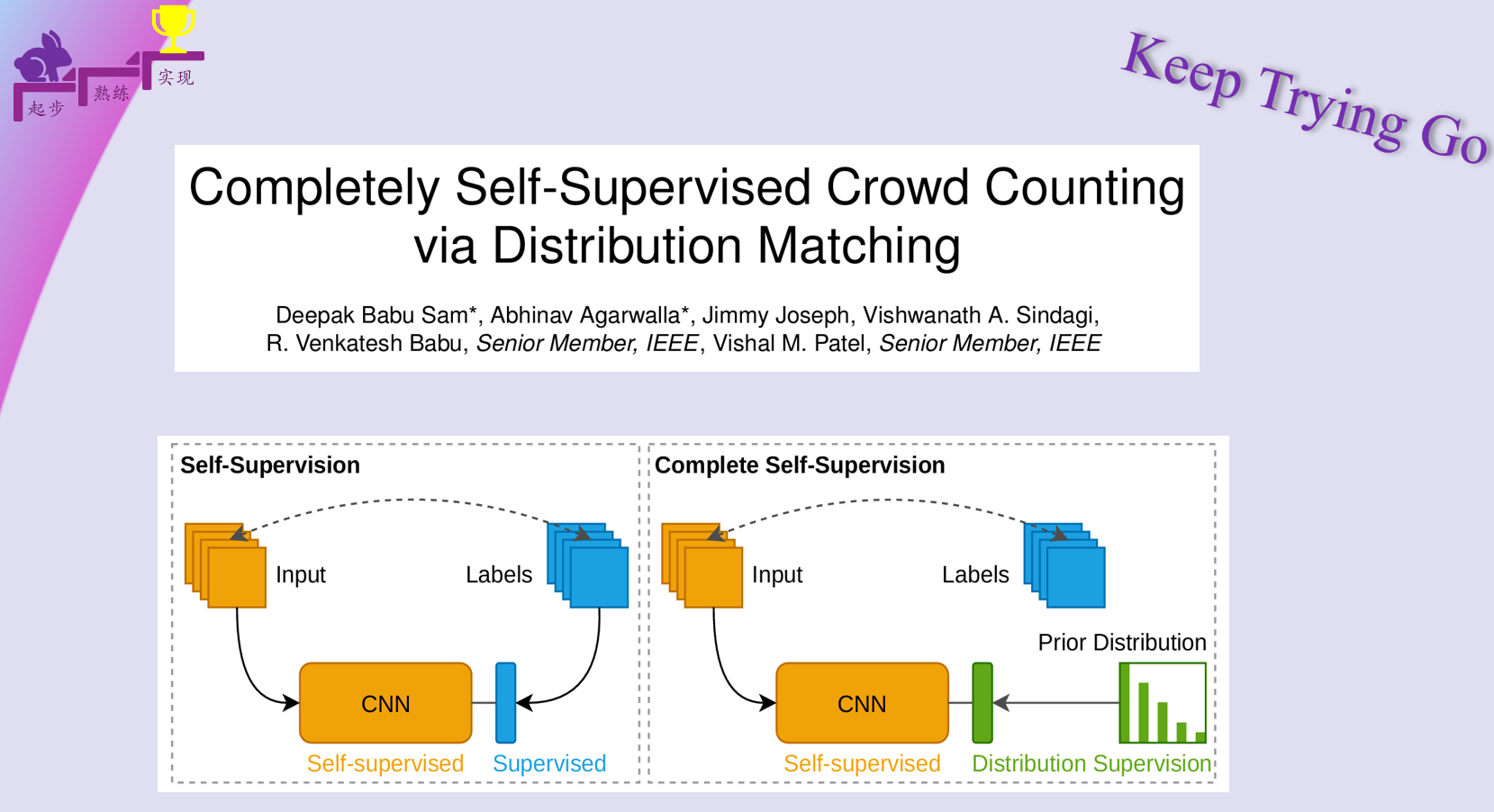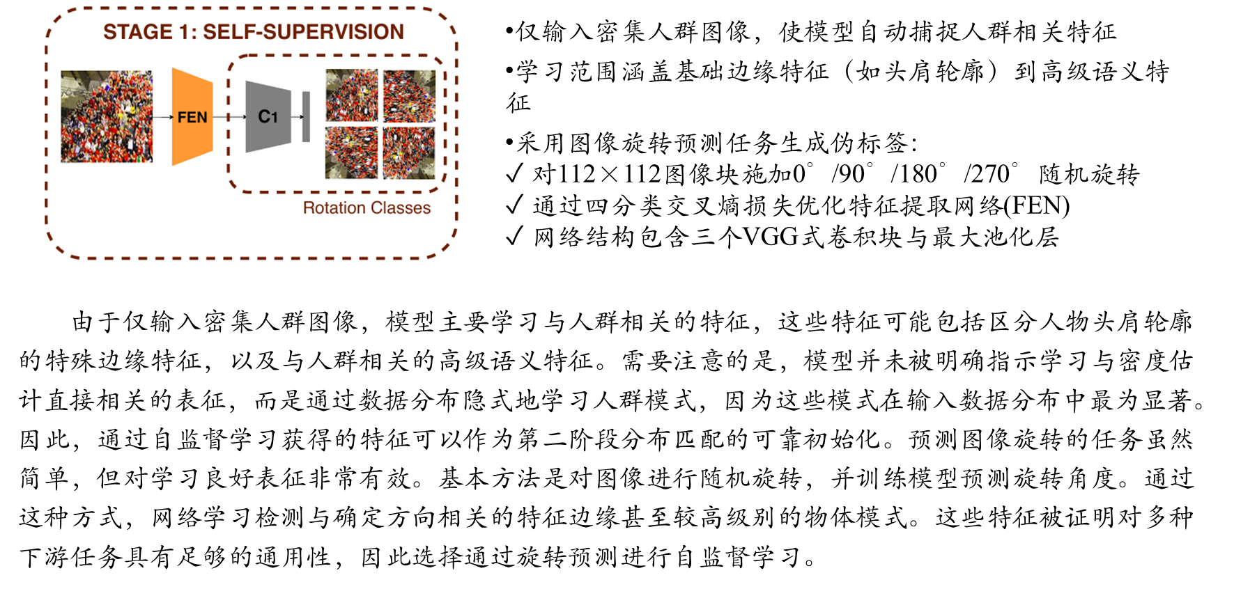 具体方法总结:针对标准自监督方法的核心局限——聚焦于人群密度估计任务,旨在彻底消除将自监督特征映射至密度图输出时对标注数据的强制依赖。换言之,致力于开发完全无需标注数据的训练范式。这一目标不仅极具挑战性,在数学上更属于不适定问题:缺乏监督信号时,模型既无法识别目标任务,也难以获得有效训练指引。