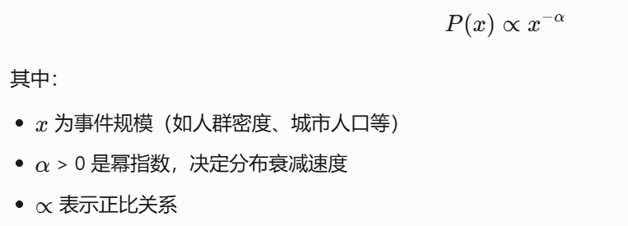 是统计学中一种常见的重尾分布,其核心特征是事件发生的概率与其大小成反比关系,即小规模事件频繁发生,而大规模事件罕见但不可忽略。其数学表达式为: