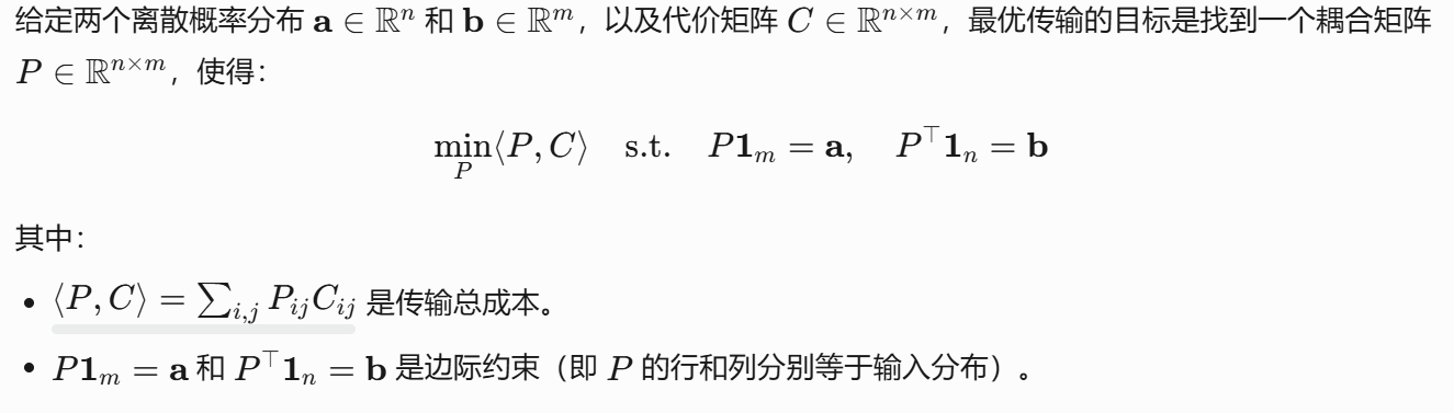 其中耦合矩阵P是非负的,并且表示从源分布的第 i 个点向目标分布的第 j 个点传输的质量(或概率) ,直白的说是从源分布到目标分布的一种“运算方案”。代价矩阵C是非负的,并且表示从源分布的第 i 个点到目标分布的第 j 个点的传输成本,可以通过欧式距离或者其他公式来衡量源分布和目标分布之间的距离。