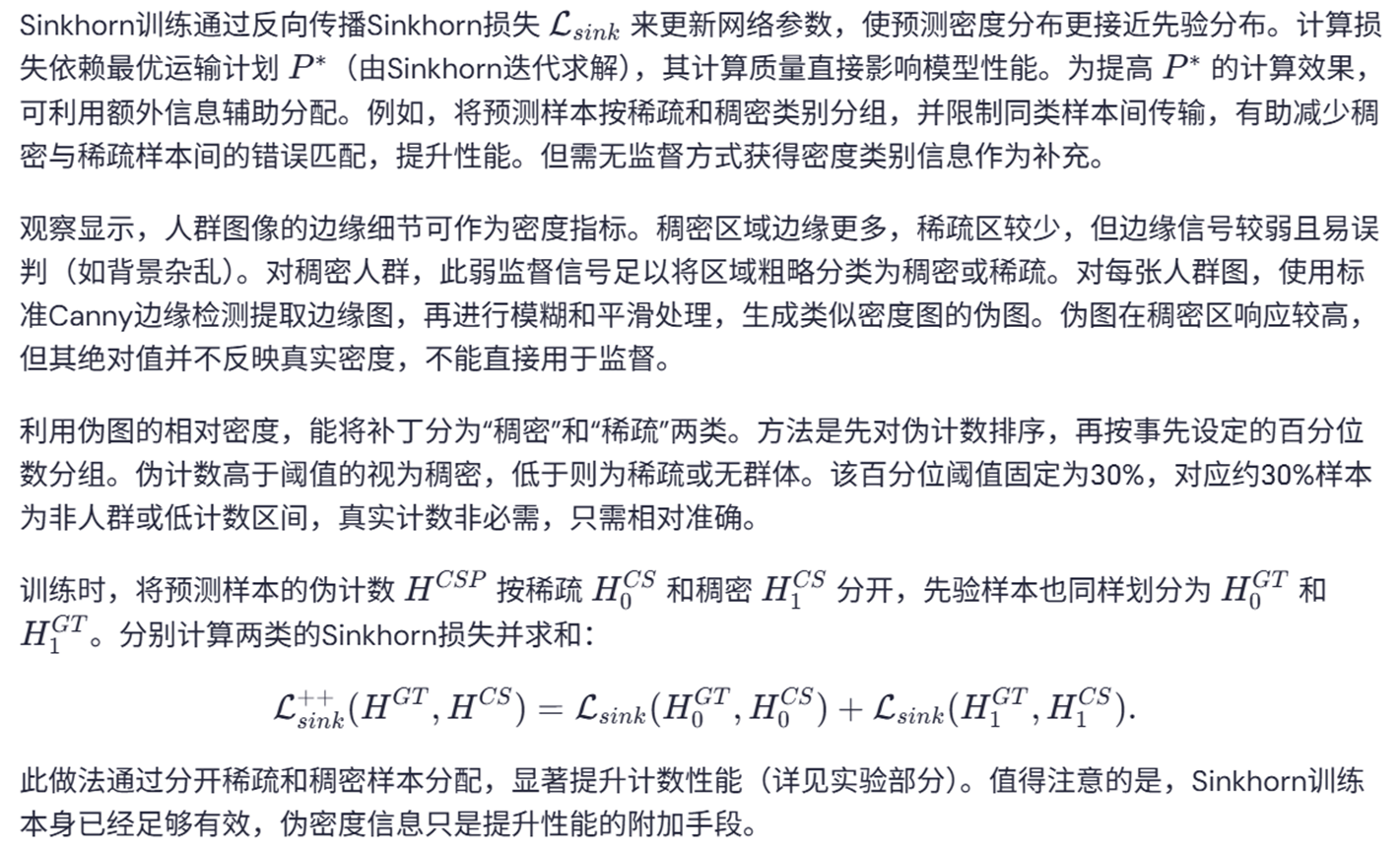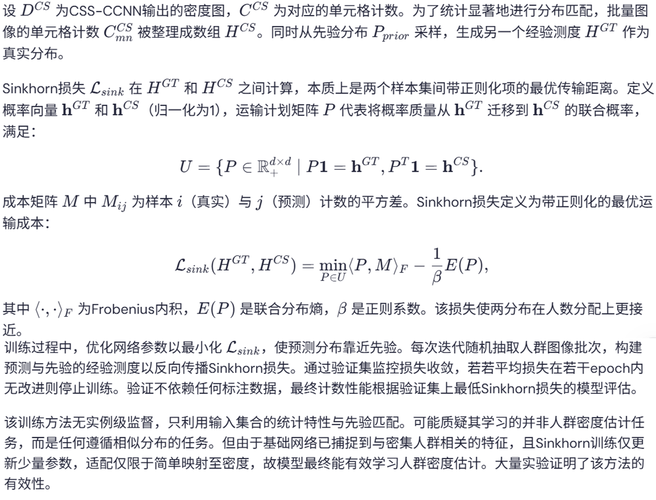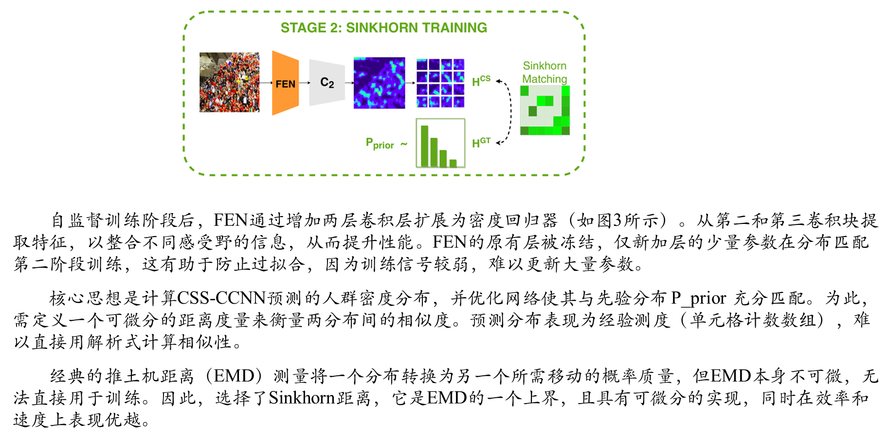 提出完全自监督的新范式,无需任何标注图像即可实现训练。除大量未标注人群图像外,该方法仅需输入数据集的近似人群数量上限作为先验信息。该方法基于自然人群服从幂律分布的特性,利用该统计规律生成反向传播误差信号。首先通过自监督预训练密度回归器,随后通过优化预测分布与先验分布的Sinkhorn距离实现特征对齐。