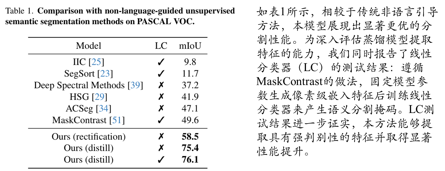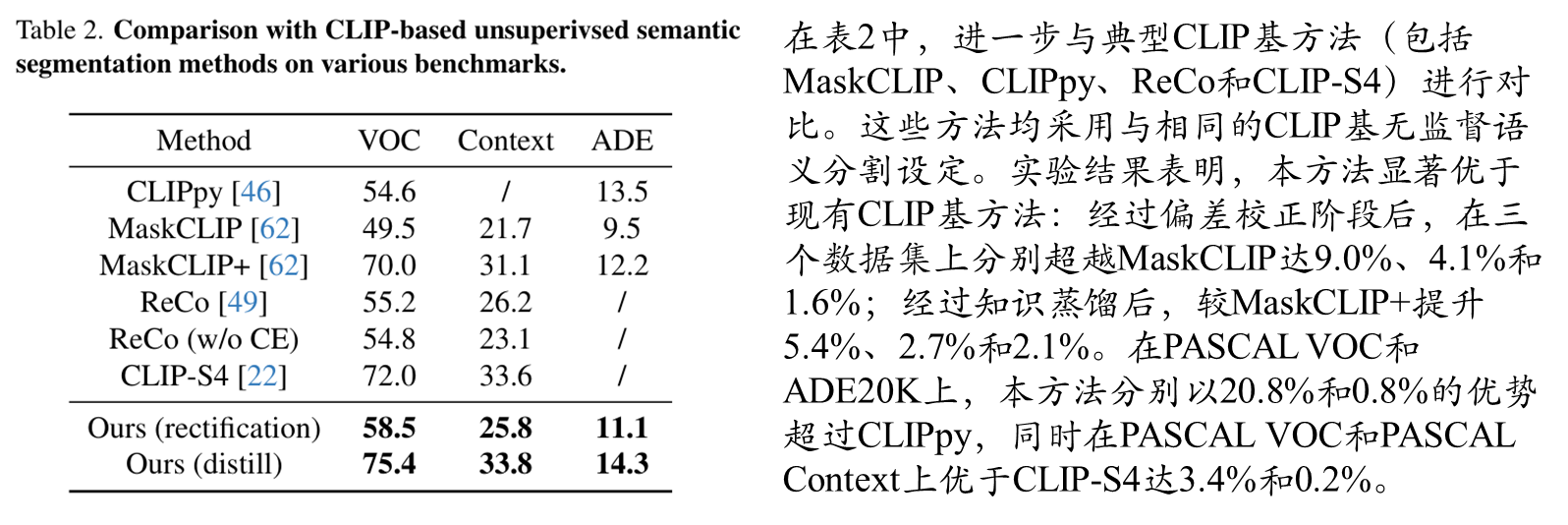 本文提出通过显式建模并校正CLIP中存在的偏差来提升无监督语义分割效果。具体而言,设计可学习的"参考"提示词来编码类别偏好偏差,同时将视觉Transformer的位置嵌入投影为空间偏好偏差表示。通过简单的逐元素减法操作,校正了CLIP分类器的逻辑输出。基于校正后的逻辑值,采用Gumbel-Softmax运算生成分割掩码。随后通过建立掩码视觉特征与各类别文本特征间的对比损失,促进有效的偏差建模。为进一步提升分割质量,通过最小化设计的掩码引导、特征引导和文本引导损失项,将校正后CLIP的知识蒸馏至先进分割架构。