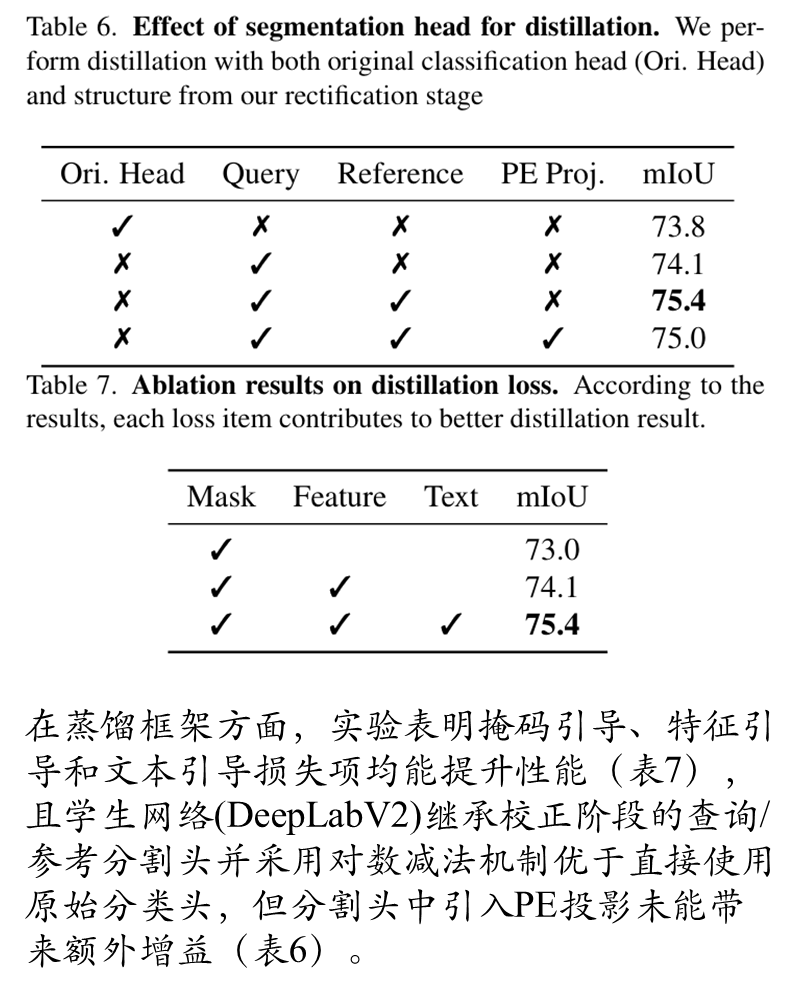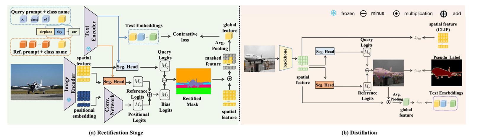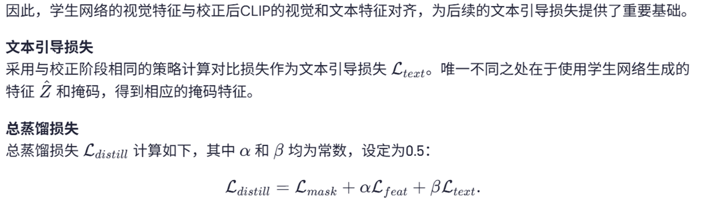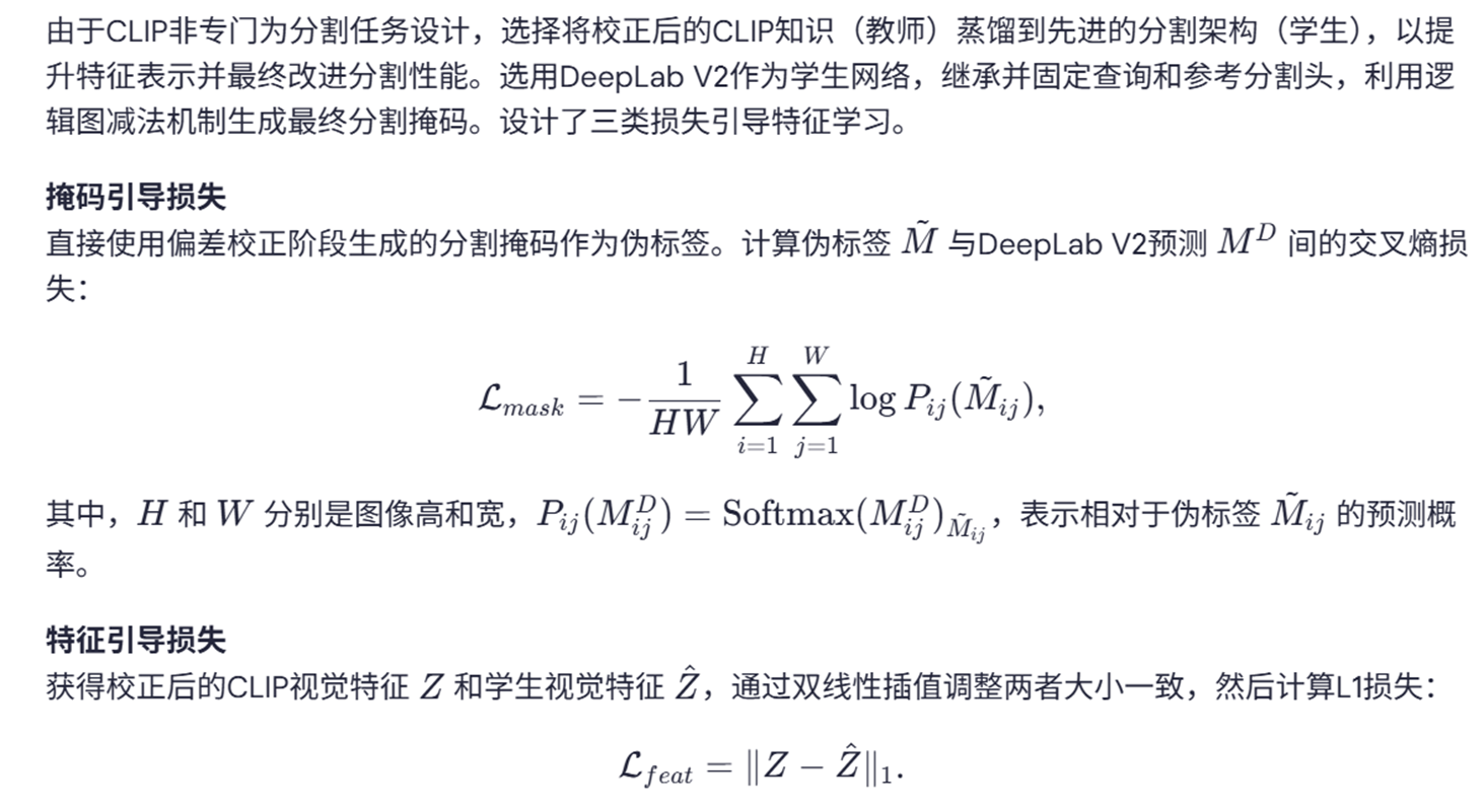 进一步通过掩码引导、特征引导和文本引导的三重蒸馏策略,将校正后的CLIP知识迁移至先进分割架构。