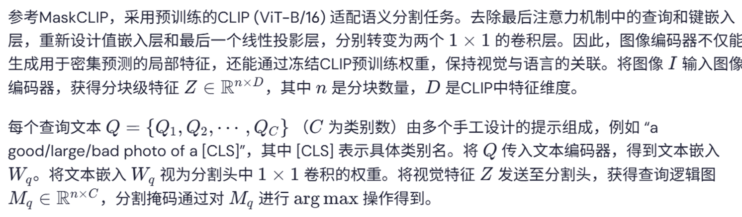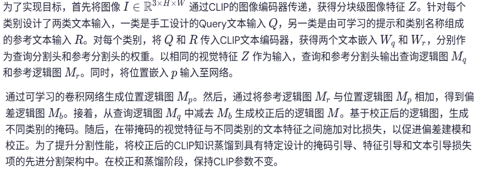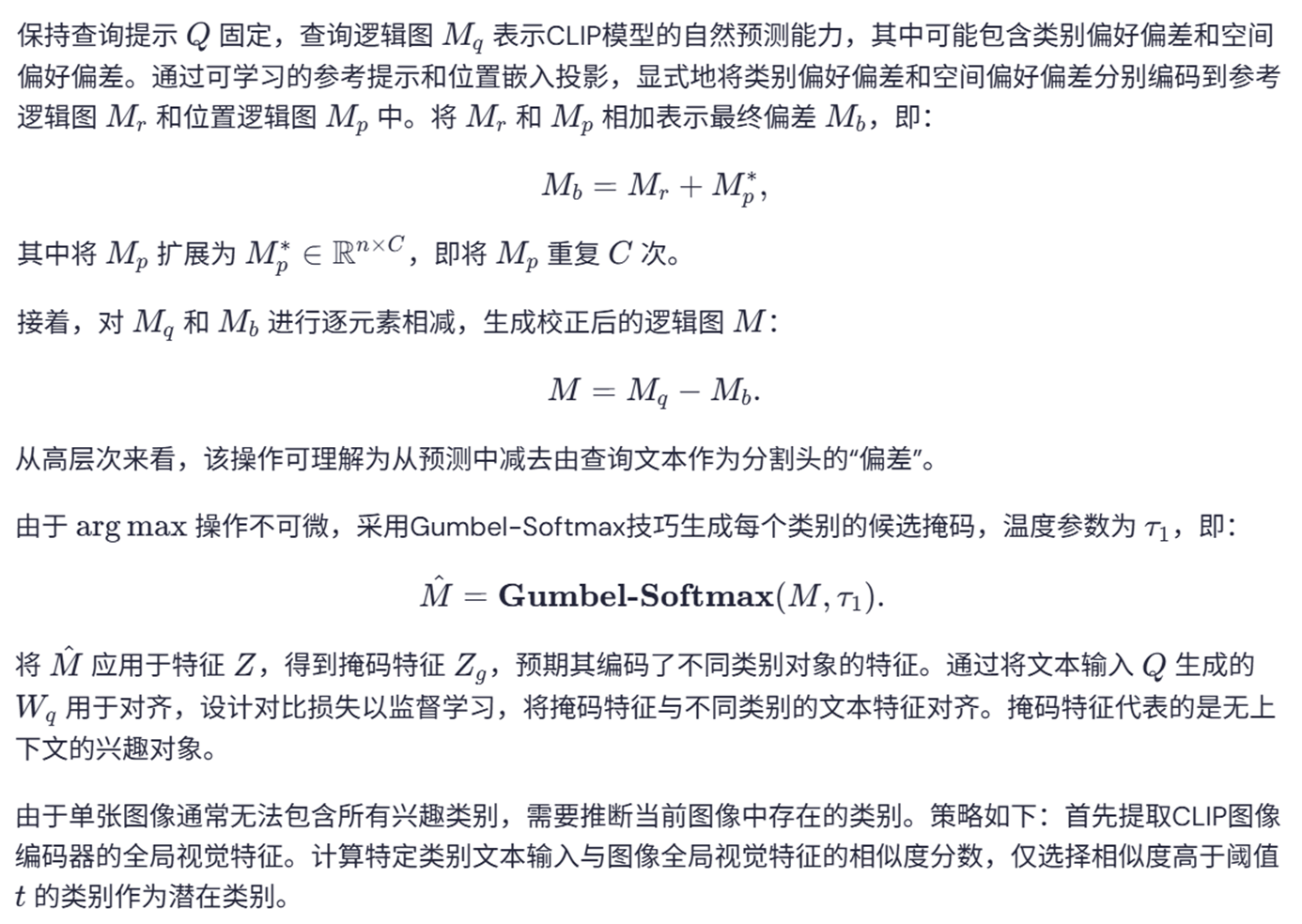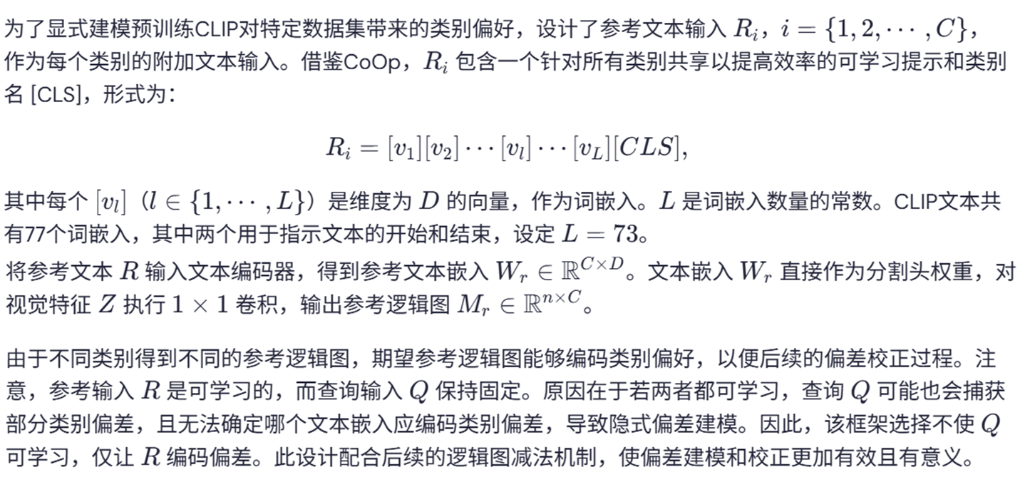 1)为每个类别设计可学习的"参考"提示词和手动设计的"查询"文本,分别生成反映类别偏好偏差的参考对数几率和代表原始分割能力的查询对数几率;
