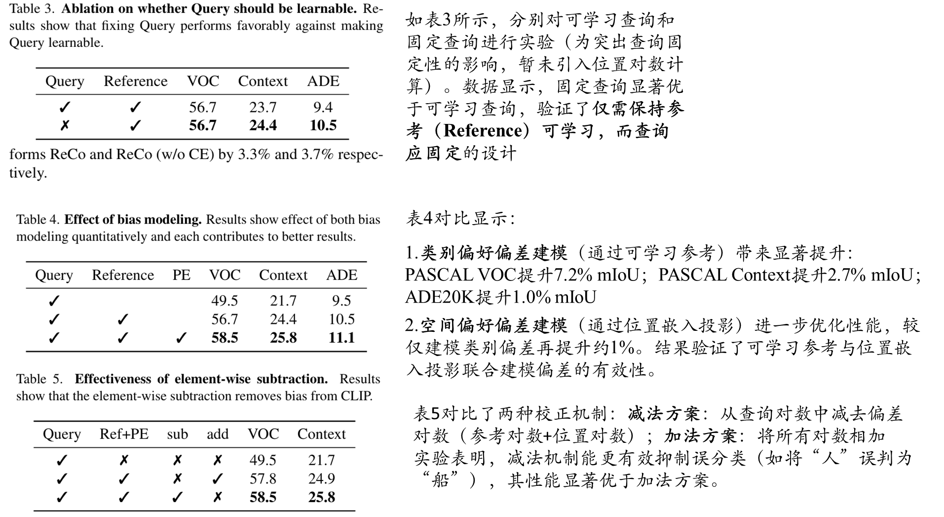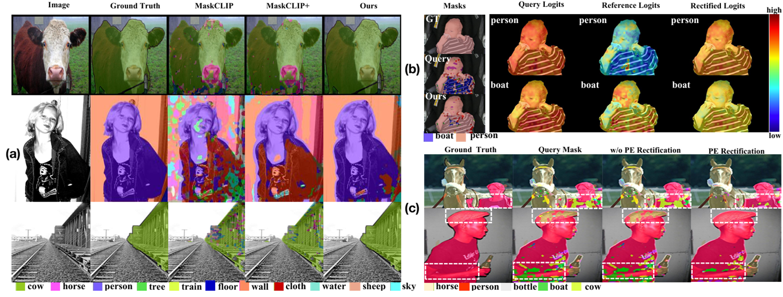 图3展示了本方法在偏差建模与校正方面的可视化验证结果。(a)在PASCAL Context数据集上的定性结果显示,通过同时校正类别偏好偏差和空间偏好偏差,本文模型显著优于MaskCLIP(+)。(b)类别偏好偏差校正的可视化分析:原始CLIP("Query"掩码列)存在将"人"(GT标注)误分类为"船"的问题,通过对比"人"和"船"通道的对数热图可见,在误分类区域"船"通道的激活值异常偏高;参考对数热图显示"人"通道激活值极低而"船"通道普遍偏高;经过提出的对数减法操作后,"船"通道激活被有效抑制,最终获得更准确的分割结果("Ours"列)。(c)空间偏好偏差校正效果:通过对比虚线框区域有无位置嵌入(PE)投影校正的结果,证明PE投影能有效编码空间偏好偏差,校正后显著提升了边界区域的分割性能。这些可视化结果验证了可学习参考提示对类别偏好偏差的建模能力,以及位置嵌入投影对空间偏好偏差的校正效果,共同证实了本方法通过元素级对数减法实现双重偏差校正的有效性。