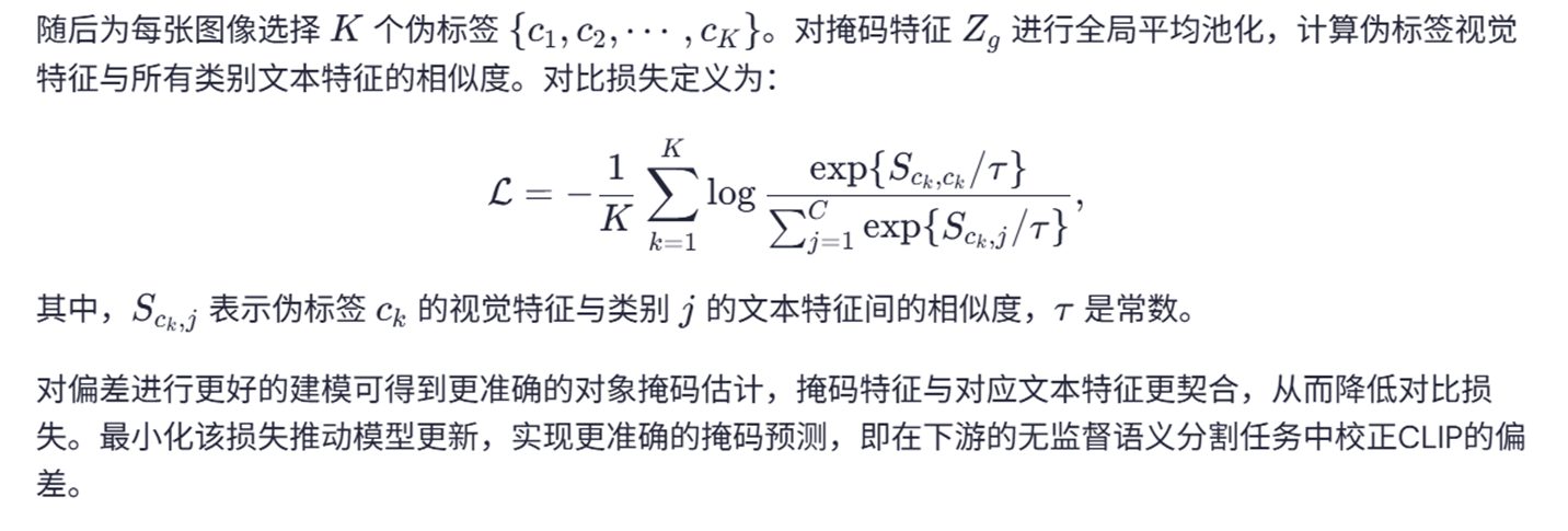 4)基于校正后的对数几率,通过Gumbel-Softmax生成分割掩码,并构建掩码视觉特征与文本特征的对比损失。