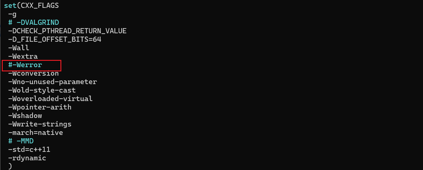 vim CMakeLists.xt(打开这个文件),并注释掉-Werror