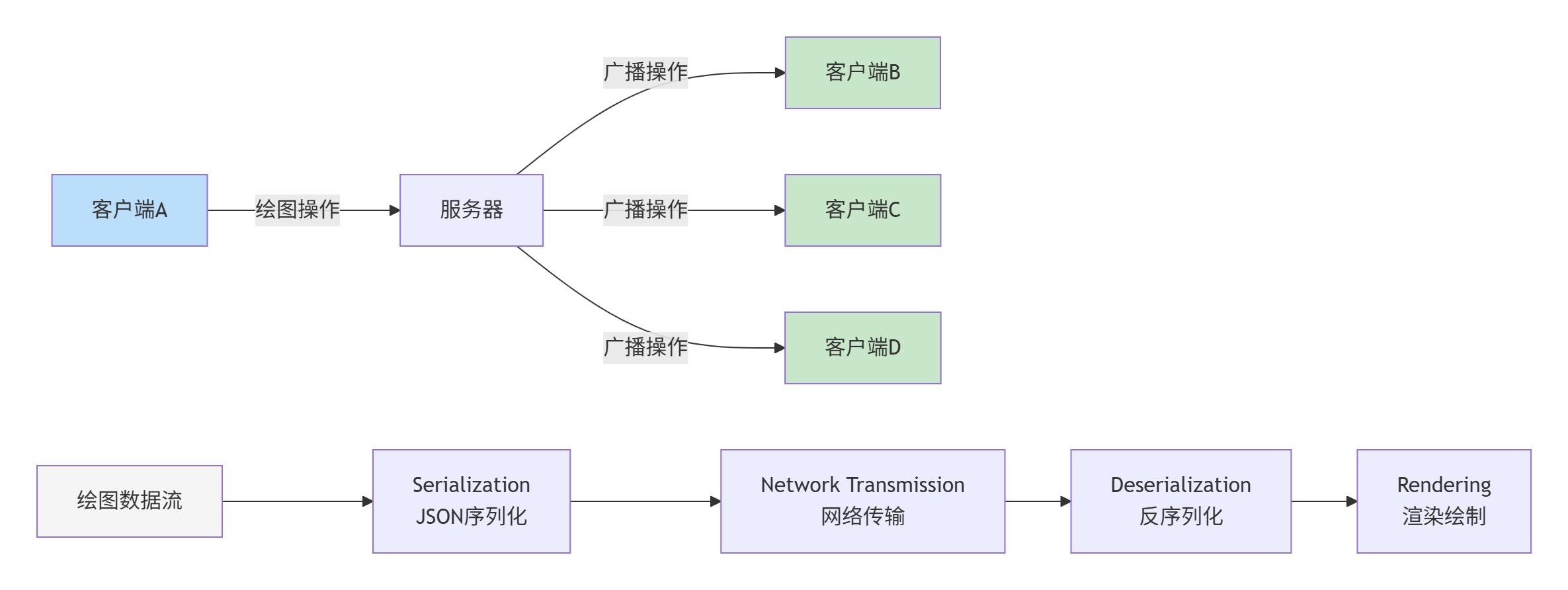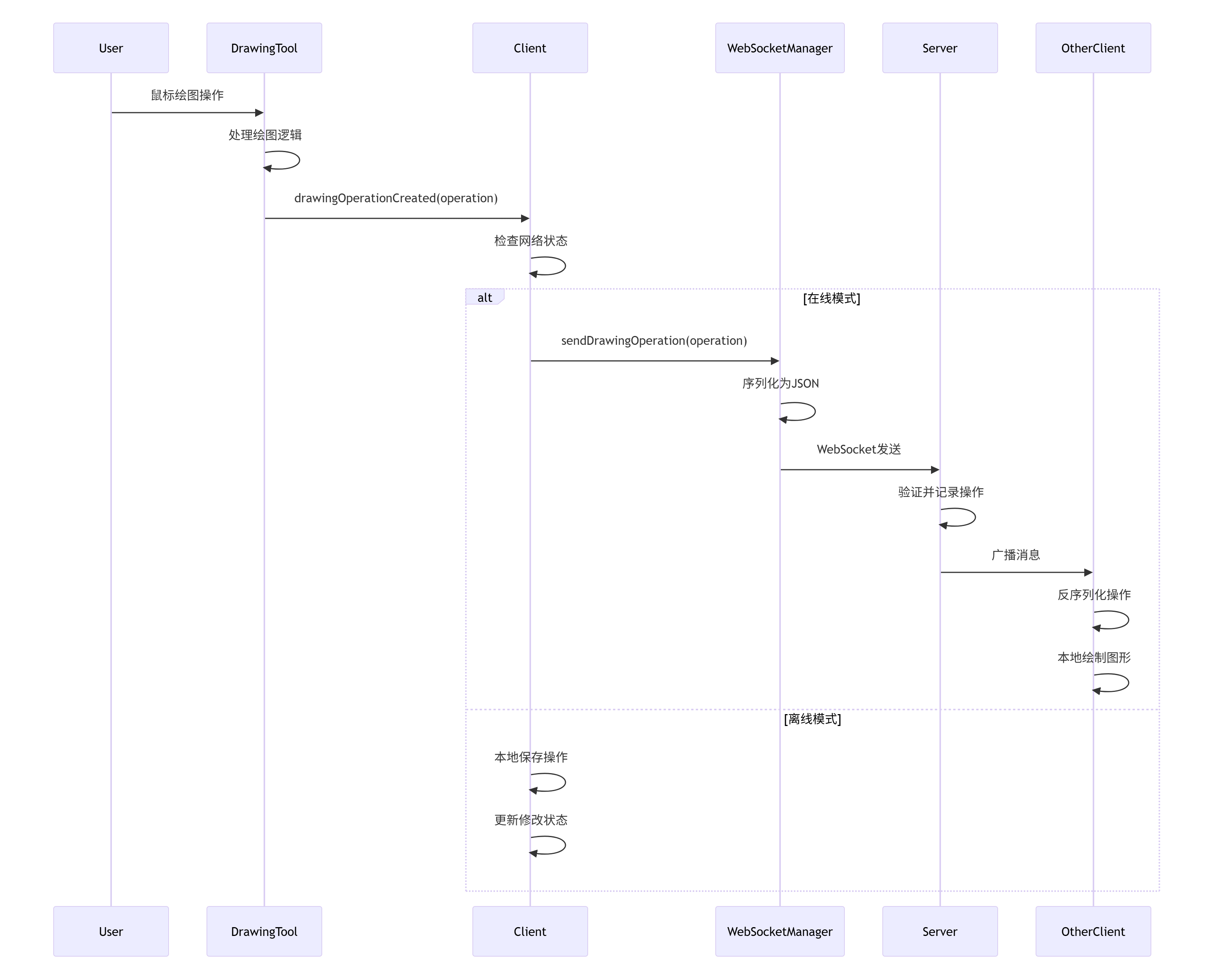 - 绘图操作同步:笔迹、形状等所有绘图操作通过网络实时广播给同一房间内的所有用户。