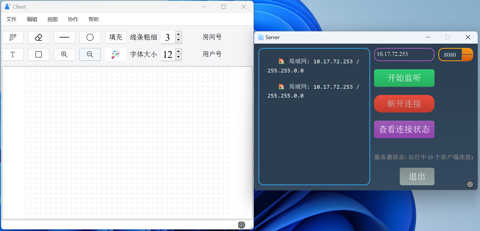 - * 由于第一个客户端已经连接并创建房间成功,这个时候已经存在一个房间号了,后面的客户端在连接服务器的时候,就可以输入这个已存在的房间号,这样就可以进入同一个房间,在线协作操作白板了。