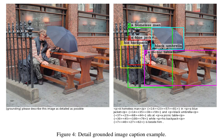b) detailed grounded image captioning(详细的描述图片中的内容 + 目标定位);
