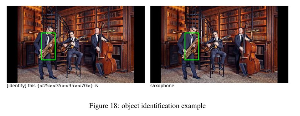 | Object parsing and grounding | 图片 + 文本目标描述 | 所有相关目标坐标+图像中目标标注结果 | 精确定位描述的目标和标注结果 | 与 Region Identification 互补:先定位(Region ID)再验证身份;与 VQA/Caption 有交叉(当问题或描述涉及“是谁/是什么实例”时) |