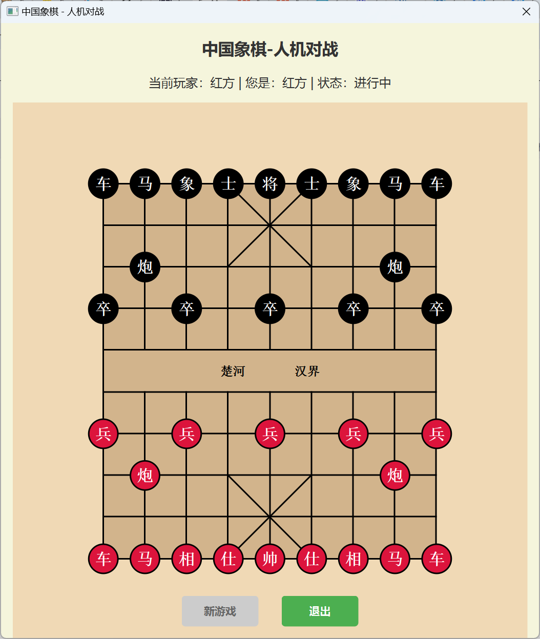 中国象棋项目实现了完整的人机对战功能,包含棋盘逻辑、走棋规则、AI智能和图形界面。AI采用Minimax算法和Alpha-Beta剪枝,支持5级难度调整。界面美观,棋子绘制精准,支持鼠标操作和移动提示。游戏流程完整,包含胜负判定、将军提示和回合切换。