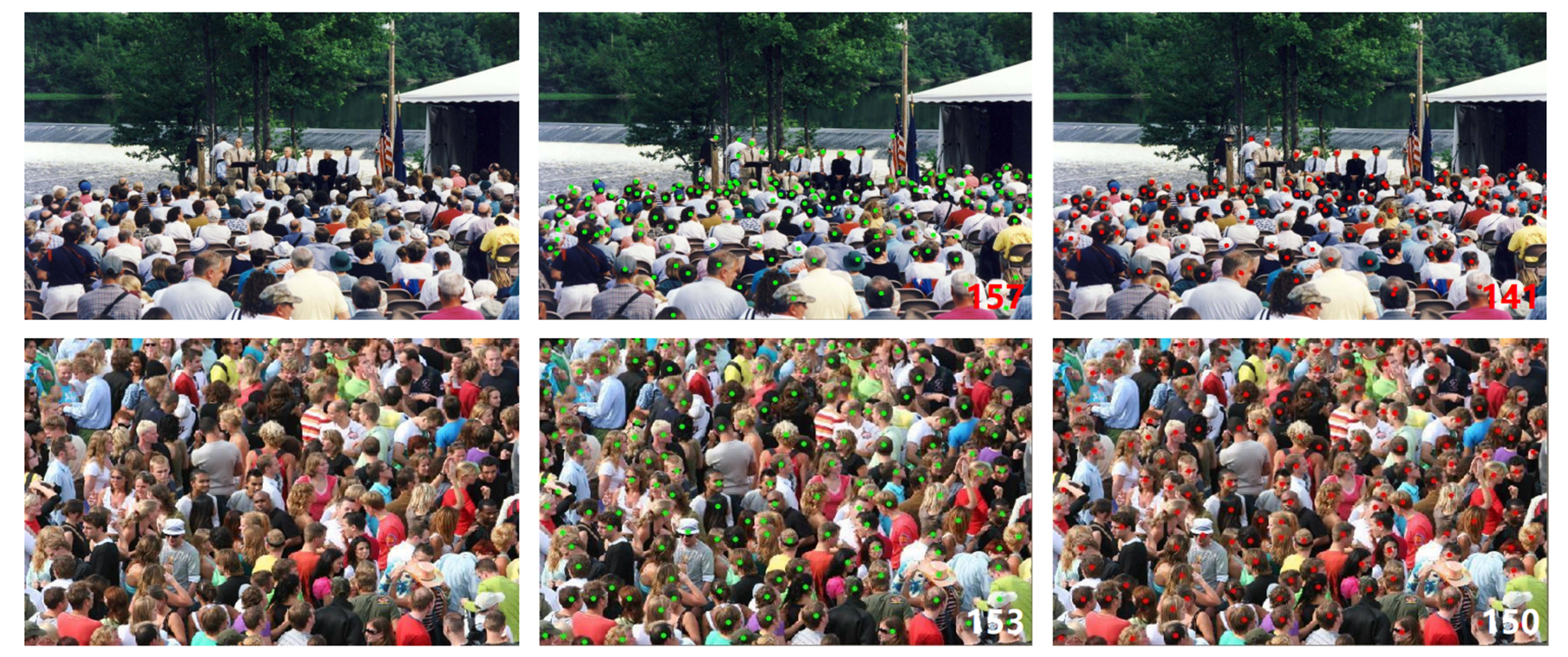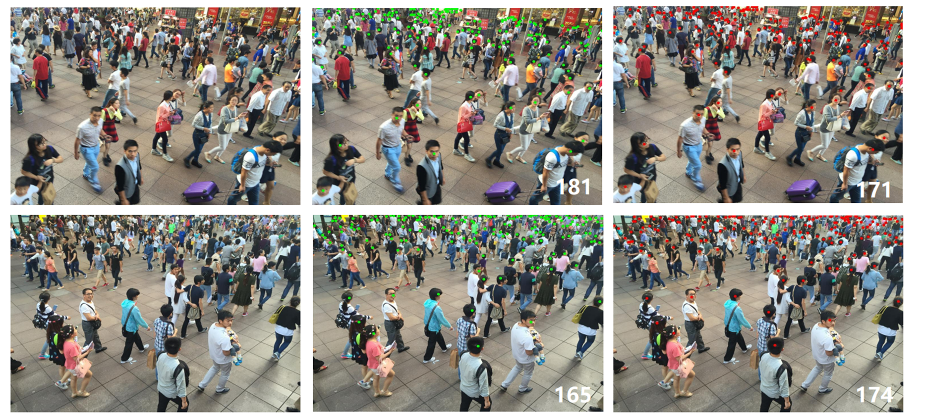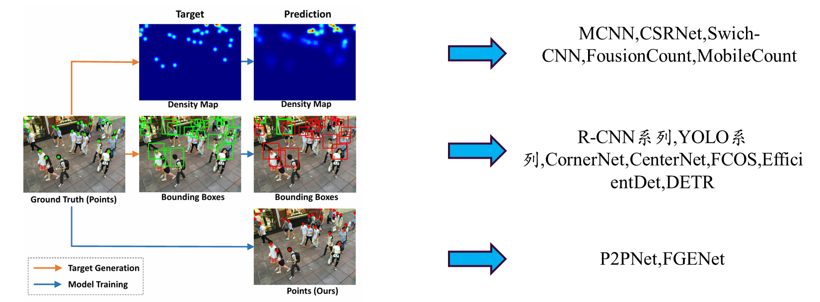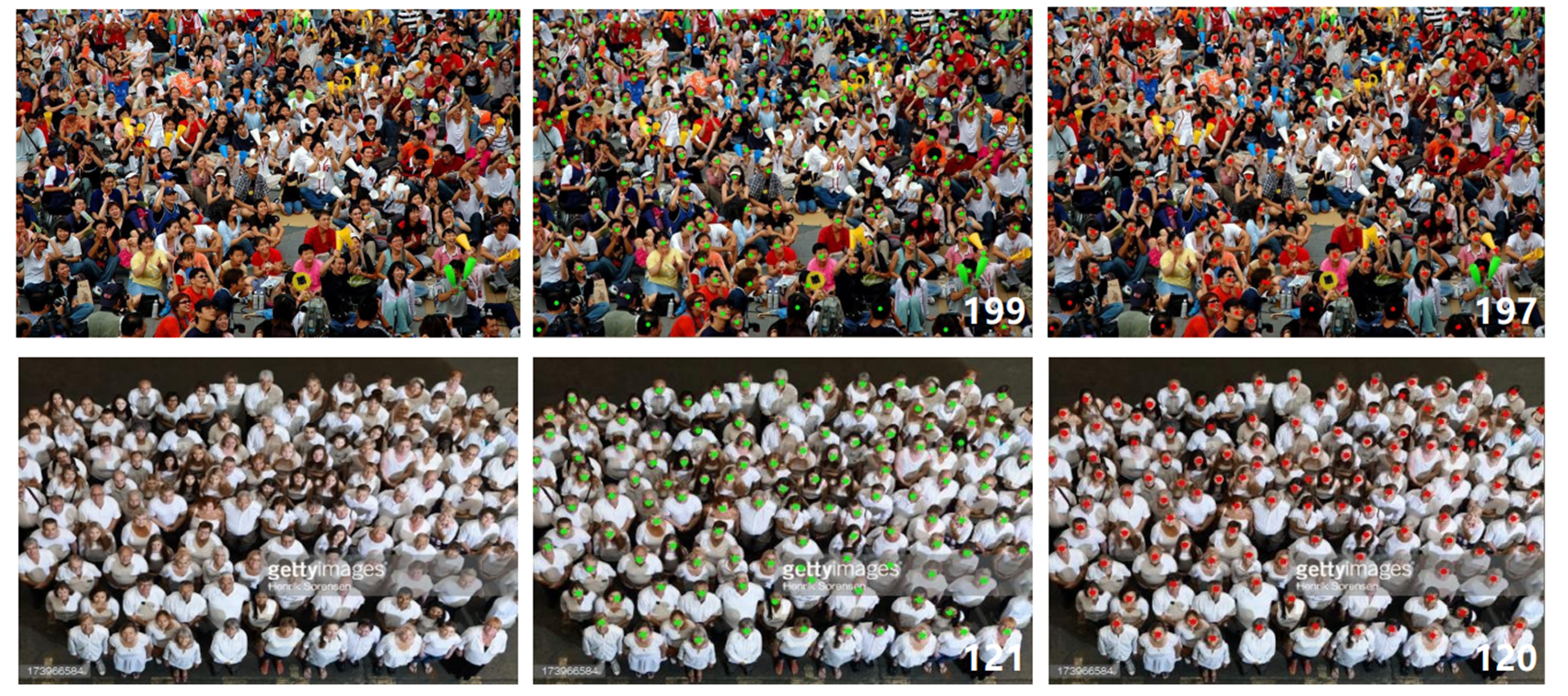 - 密度图回归方法:主流的计数方法通过预测密度图再求和得到总人数。但这种方法无法提供个体的精确位置,且密度图本身存在模糊性和回归误差。