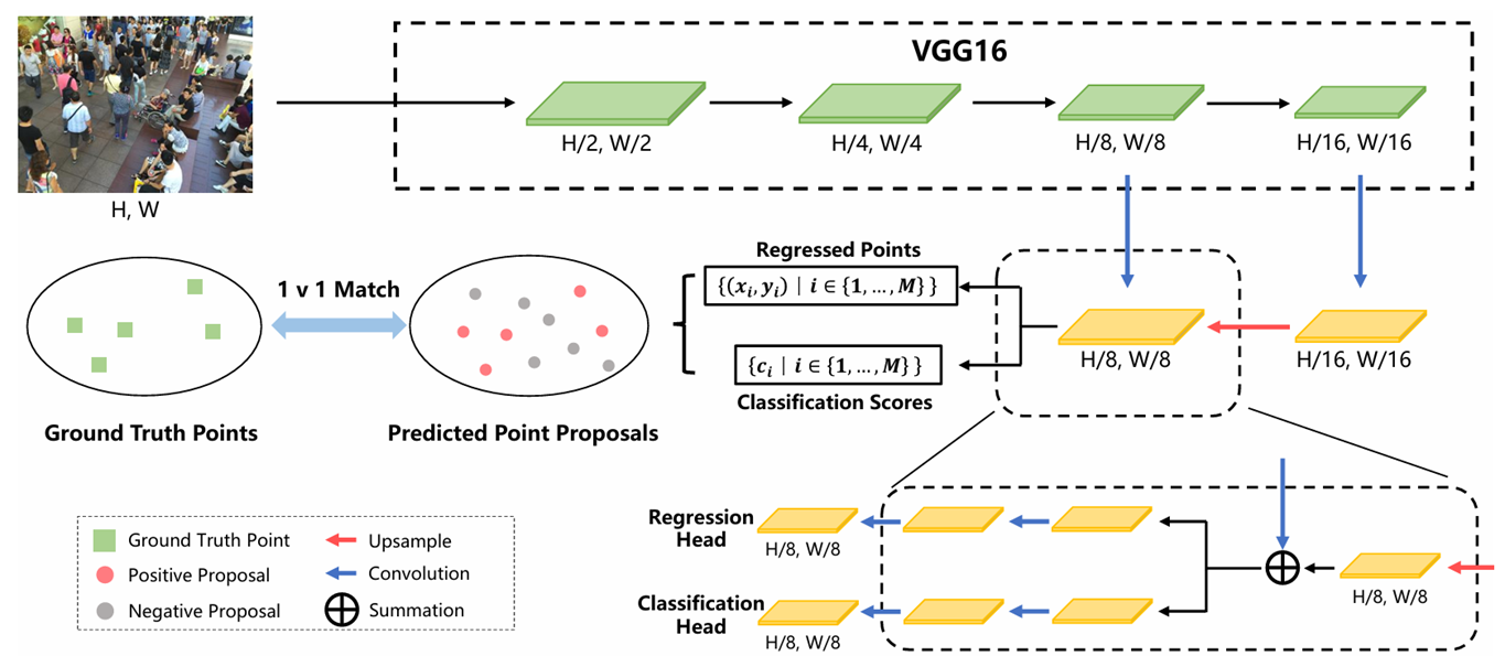 该模型基于VGG16构建,首先引入上采样路径以获得细粒度深度特征图,随后通过双分支结构同步预测点候选集及其置信度分数。流程中的关键步骤是确保点候选与真实标注点之间实现一对一匹配,这一机制决定了各候选点的学习目标。