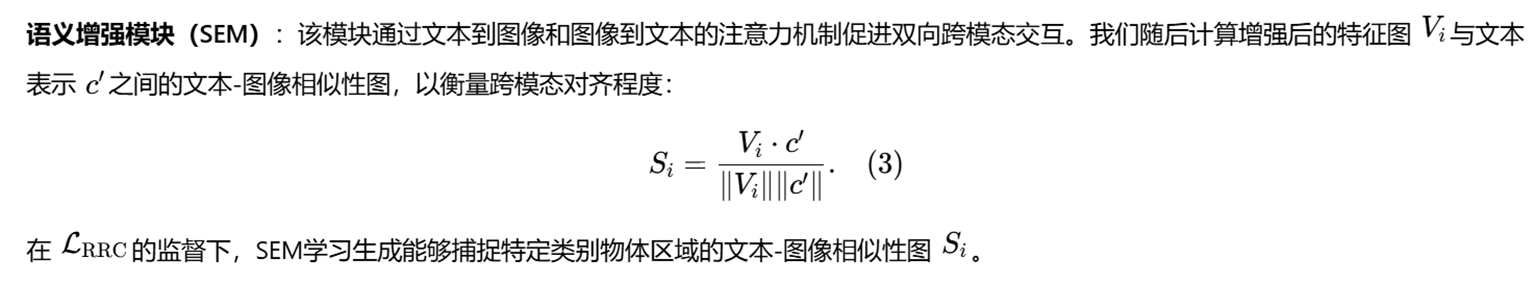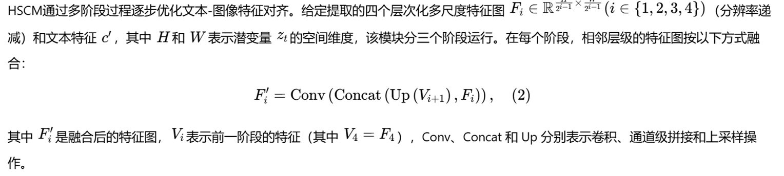 - 第二实现方法:该模块分阶段处理从去噪U-Net中提取的多尺度特征。它包含两个子模块:•语 义增强模块(SEM):通过双向跨模态注意力机制增强文本和图像特征的交互,并 生成文本-图像相似度图;