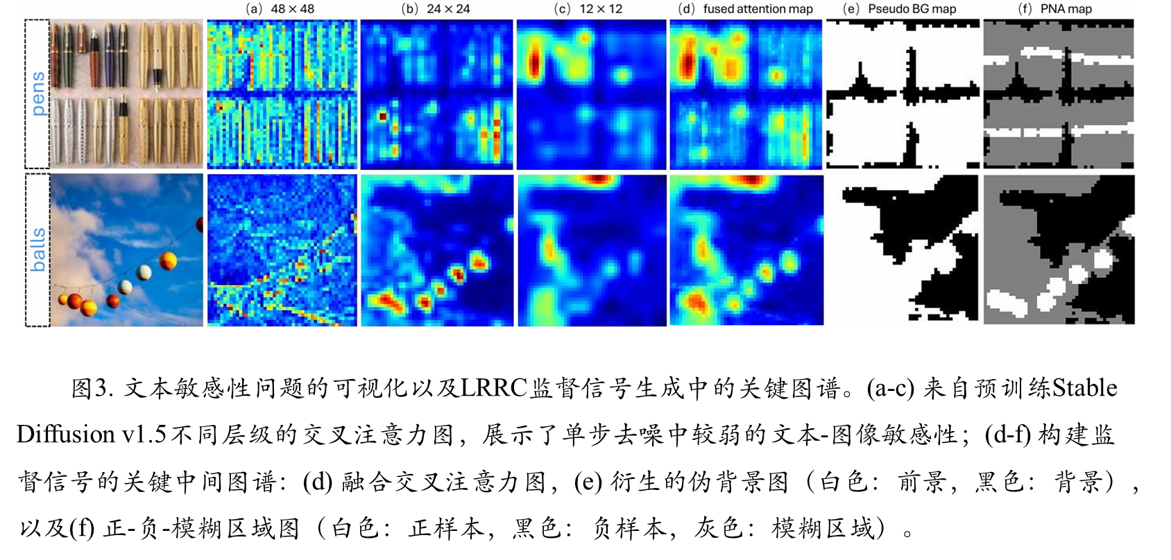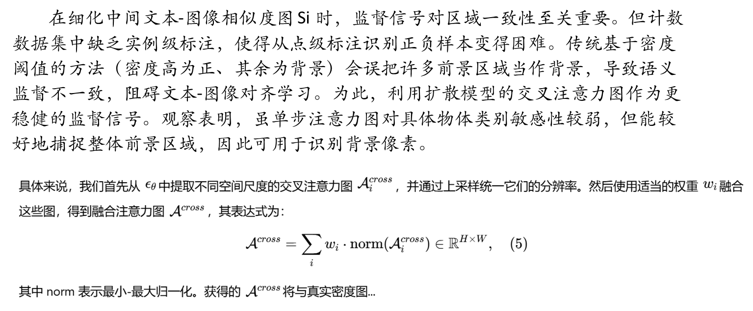 首先:为中间生成的相似度图提供可靠的监督信号,解决计数数据集中缺乏实例级标注所带来的正负样本难以区分的问题。本文发现,尽管单步去噪的交叉注意力图对特定类别不敏感,但它们能有效捕捉图像中的整体前景区域。