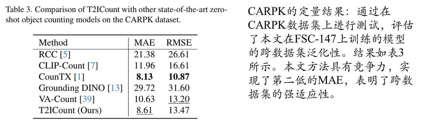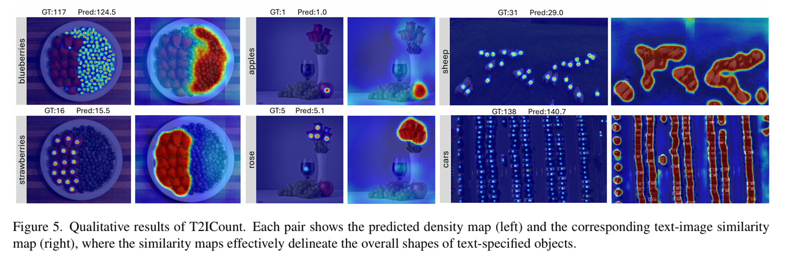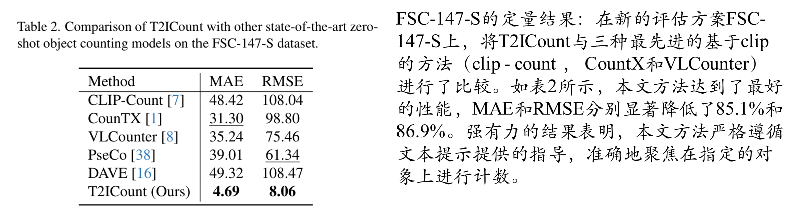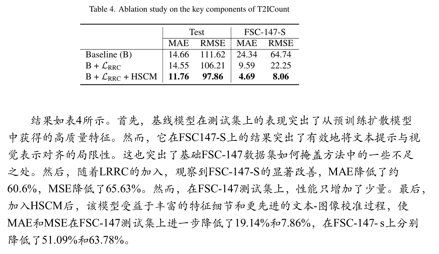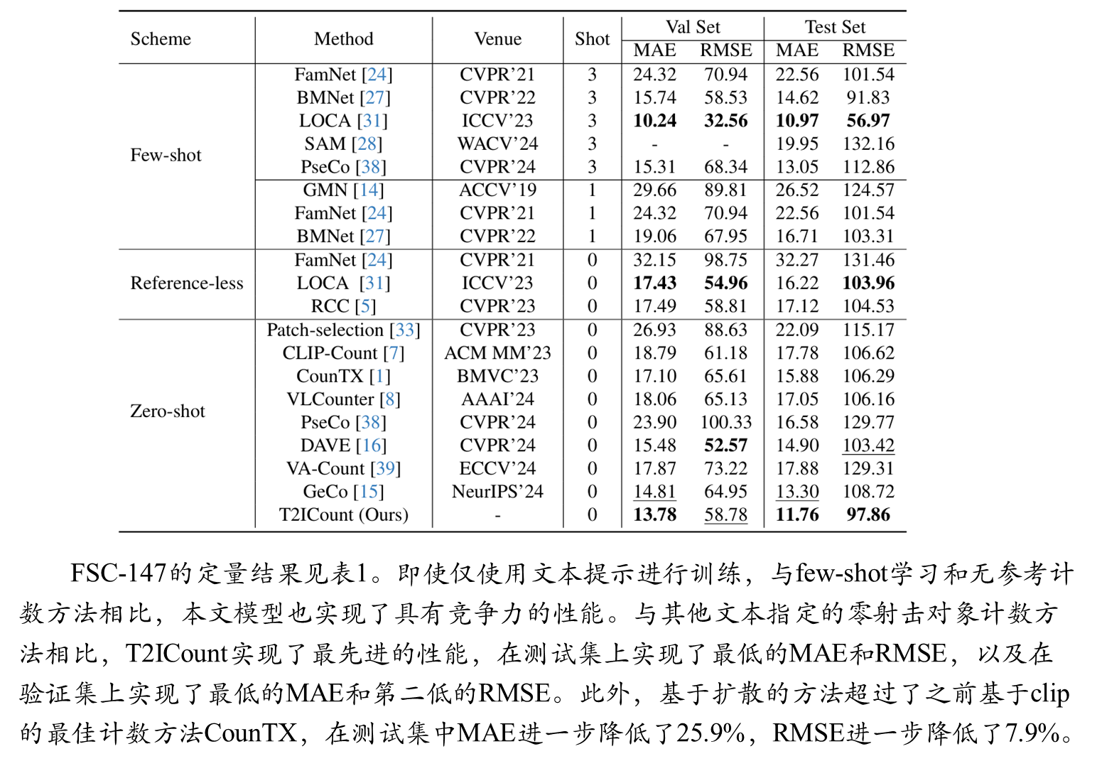 本文提出的T2ICount框架通过创新性地利用扩散模型和引入HSCM与L_RRC,有效解决了零样本计数中的文本不敏感性难题。同时,通过构建FSC-147-S基准,为未来文本引导计数研究提供了更严格的评估标准。实验表明,该方法在现有基准和新的挑战性任务上均达到了领先水平。