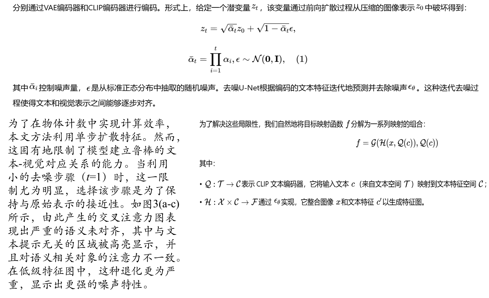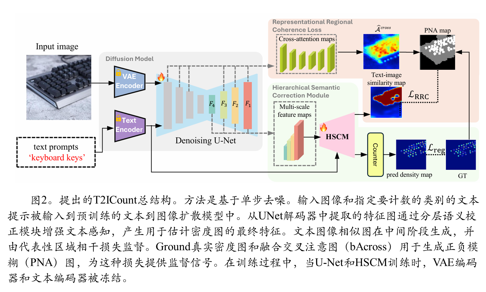 本文提出了T2ICount,一个基于扩散模型的框架。其核心思想是利用预训练文本到图像扩散模型(如Stable Diffusion)中蕴含的丰富先验知识和细粒度视觉理解能力。为了追求实际应用中的效率,T2ICount采用单步去噪来提取特征,而非耗时的多步去噪过程。但这导致了文本-图像交互的减弱,即文本敏感性降低。