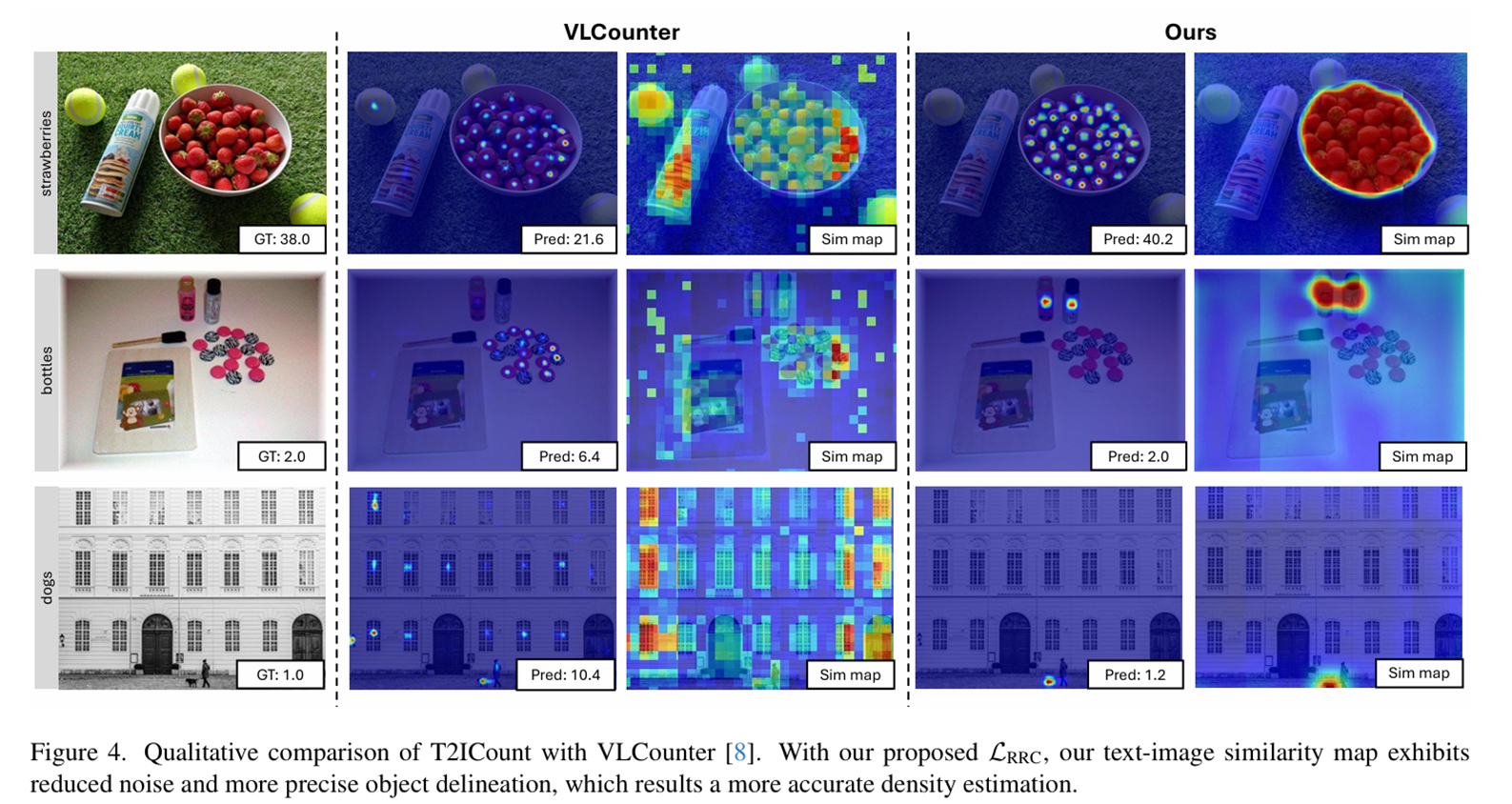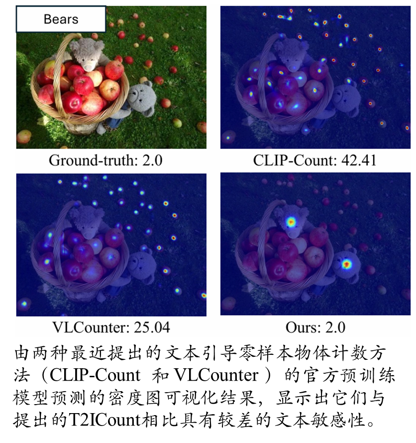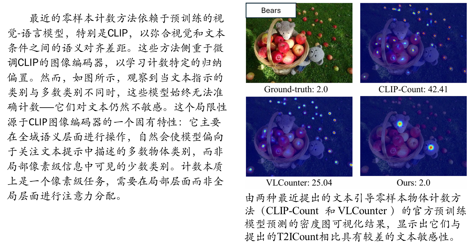 当前最先进的方法(如CLIP-Count, VLCounter)主要依赖于预训练的视觉-语言模型(如CLIP)。然而,这些模型存在一个关键缺陷——文本不敏感性。如图1所示,当文本指定的类别与图像中的多数类别不同时,这些模型往往无法准确计数,因为它们倾向于关注图像中占主导地位的物体,而忽略了文本提示的指导。