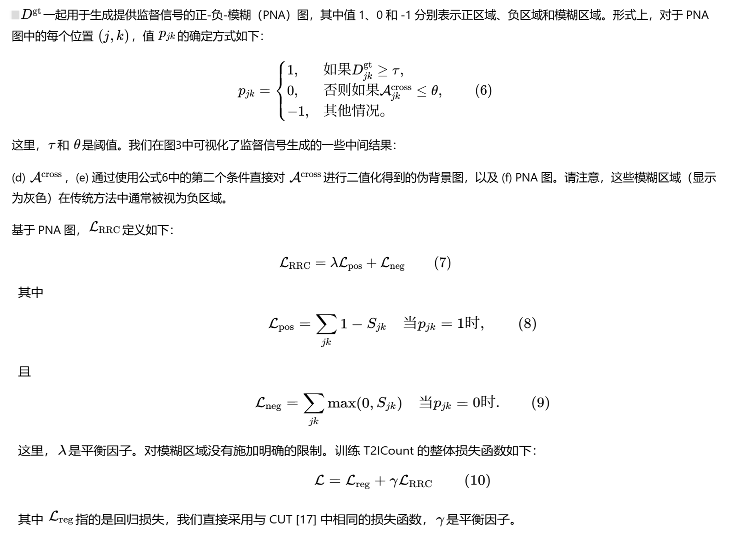 最后,融合多尺度交叉注意力图生成一个统一的前景区域估计图。将此图与真实密度图结合,生成一个正-负-模糊区域(PNA)map(图3f)。该map明确标明了正样本(高密度区域)、负样本(低注意力背景区域)和模糊区域。L_RRC损失函数在此基础上,鼓励正样本区域有高相似度,负样本区域有低相似度,而对模糊区域不施加约束,从而实现了更精确的特征学习。