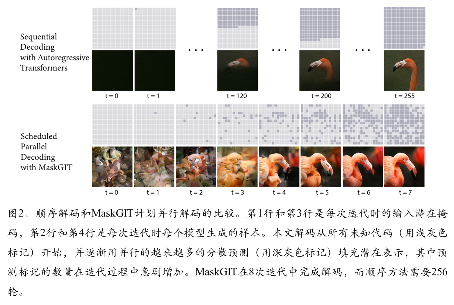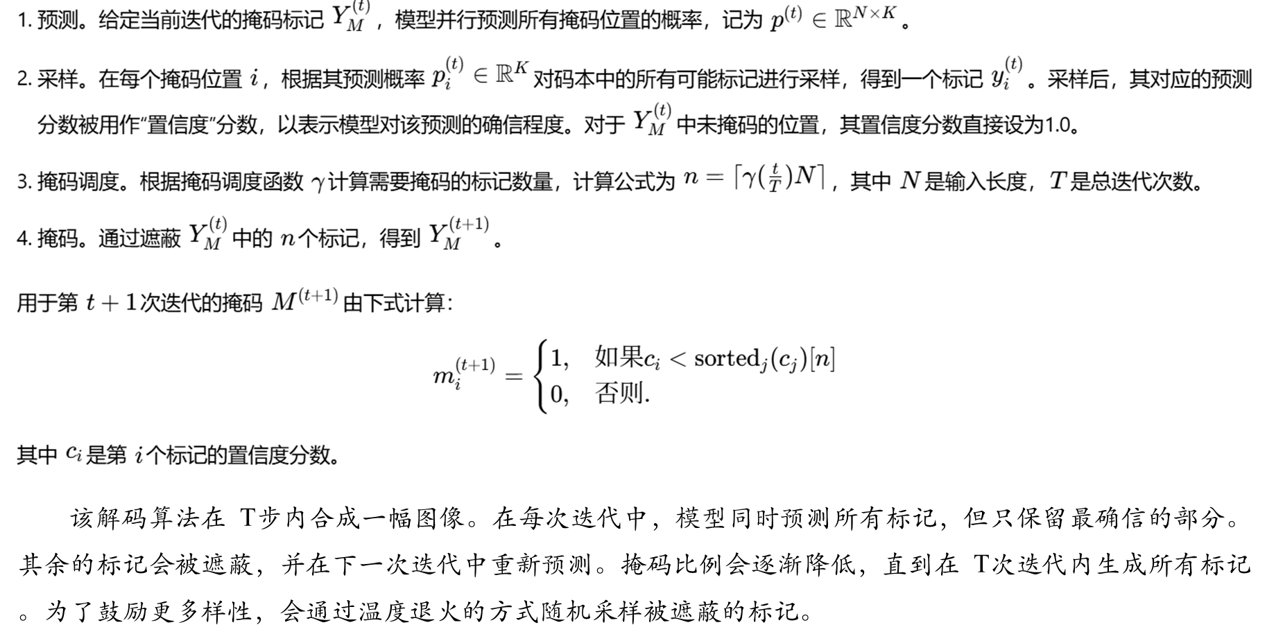 在自回归解码中,标记是基于先前生成的输出依次生成的。由于图像标记长度(例如 256 或 1024)通常远大于语言标记长度,此过程无法并行,因而速度很慢。我们引入了一种新的解码方法,其中图像中的所有标记均可并行生成。这一点之所以可行,是因为模型具有双向自注意力机制。 本文模型能够单次推断并生成整个图像。发现,由于这与训练任务存在不一致,实现起来有挑战。提出的迭代解码方法。在推理时生成图像,从一张空白画布开始,即所有标记均被遮蔽(masked out),表示为 YM(0)。对于第 t次迭代,算法运行如下: