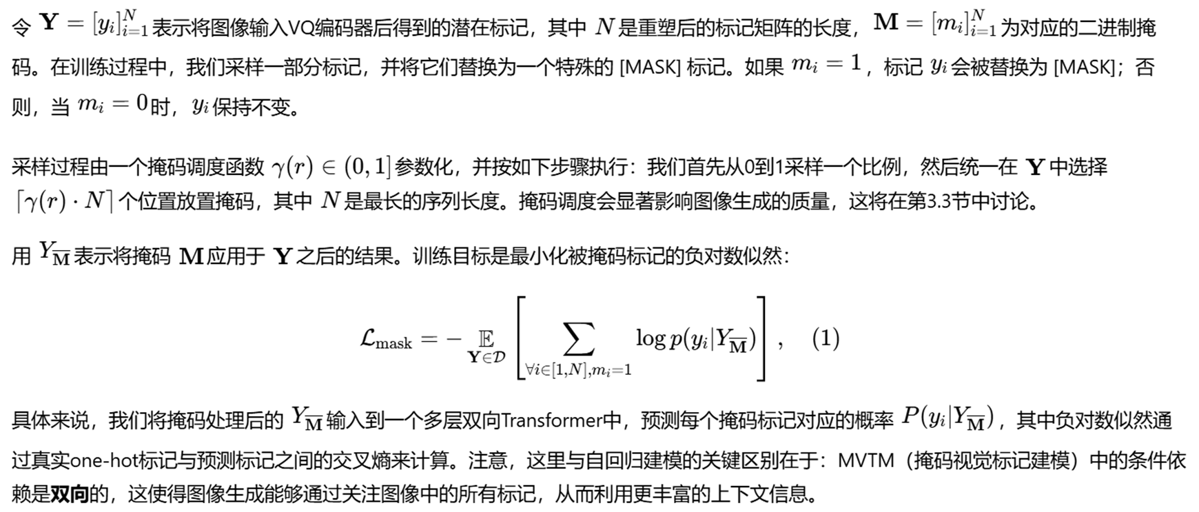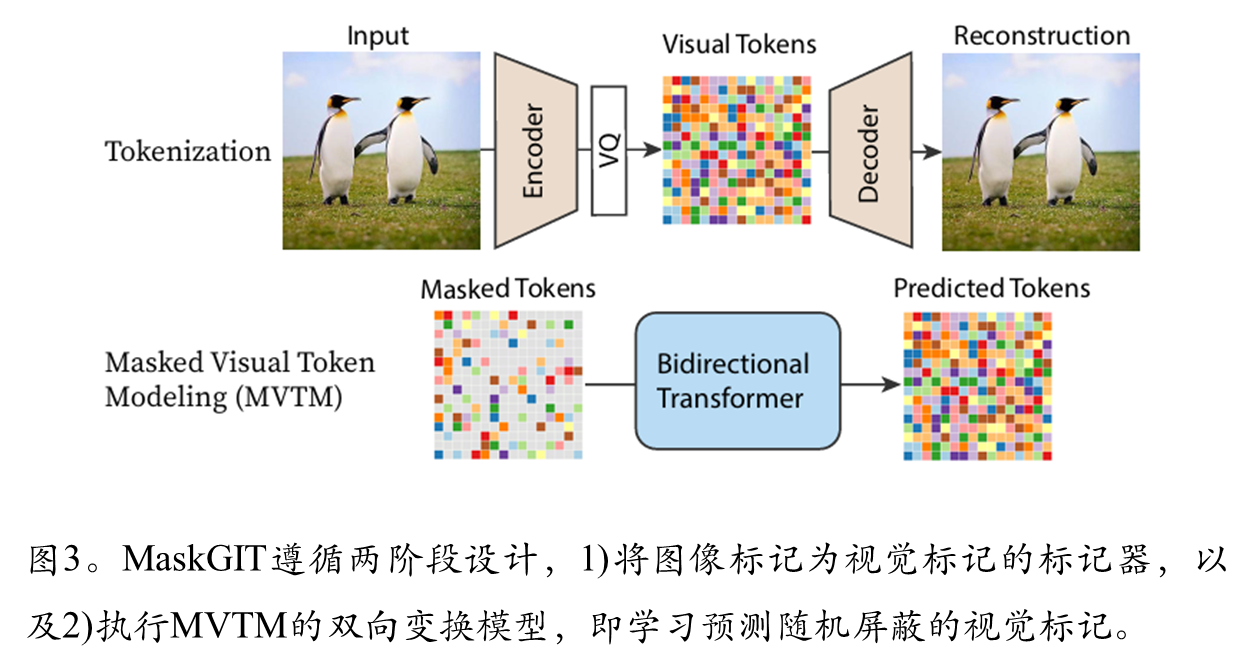 训练阶段:采用掩码视觉token建模(MVTM),随机掩码部分token后通过双向注意力预测被掩码内容,学习全局上下文依赖。