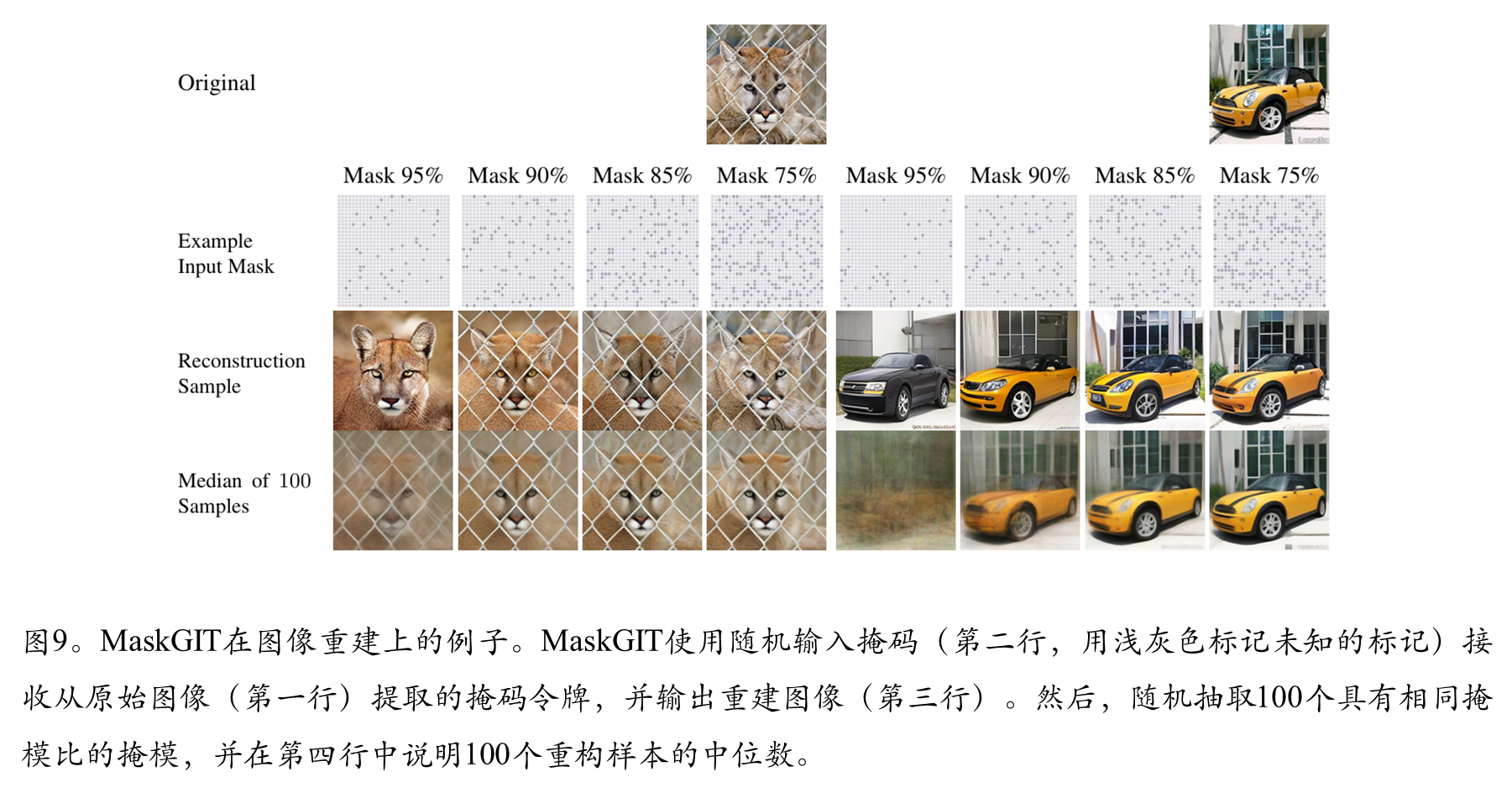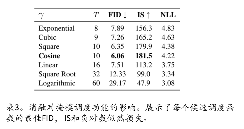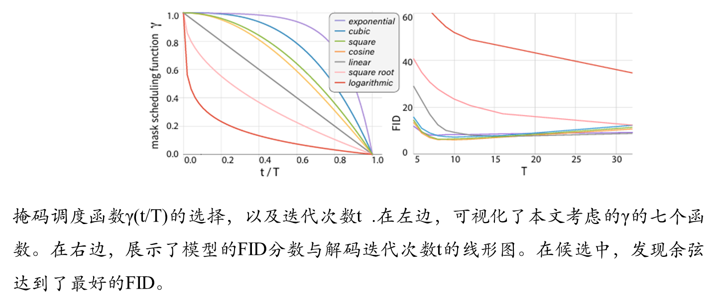 图像生成的质量显著依赖于掩码调度函数γ(·)的设计。该函数决定了解码过程中每一步应遮蔽(mask)多少比例的标记,并需满足特定数学性质以适配迭代解码流程。