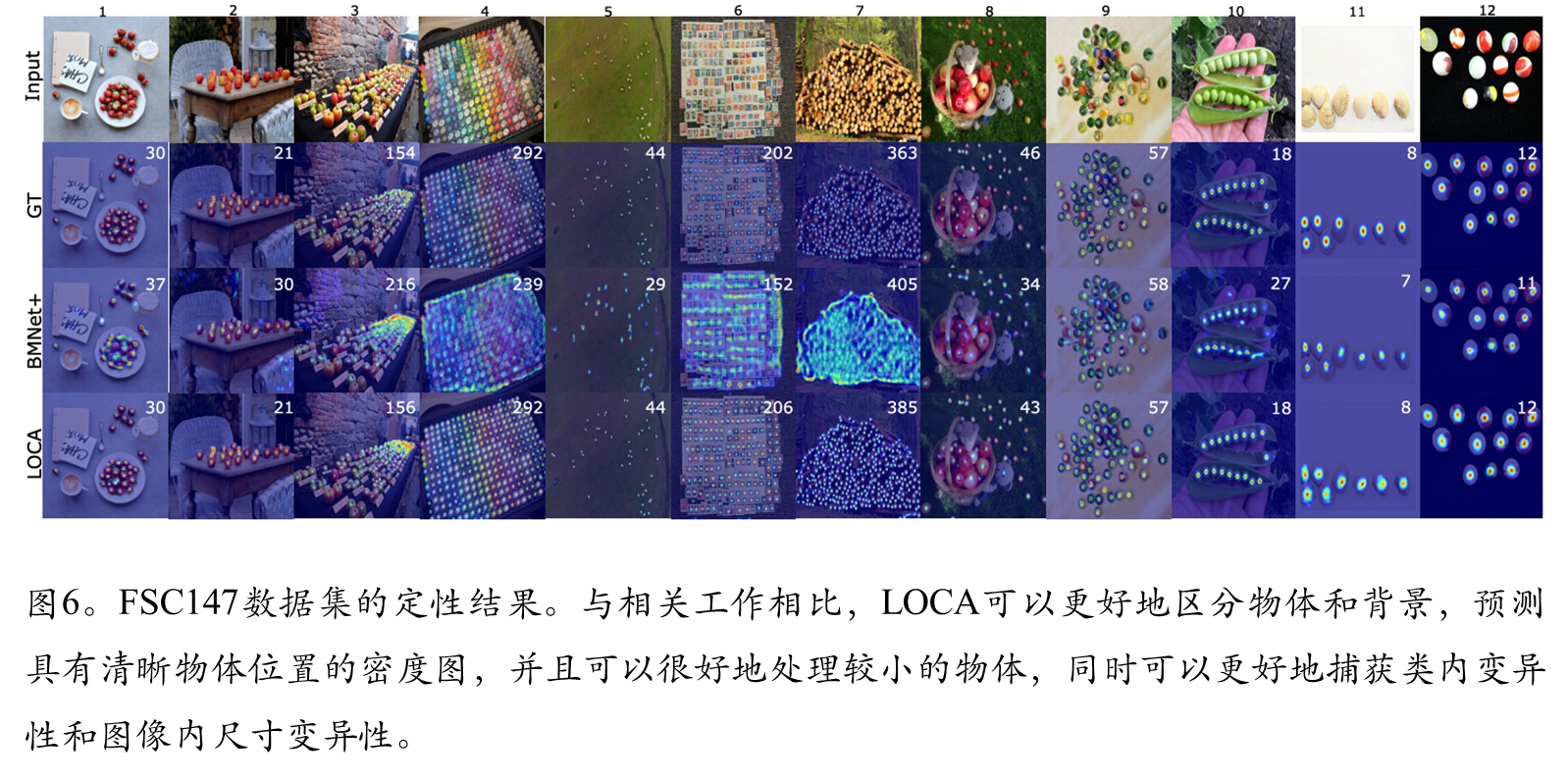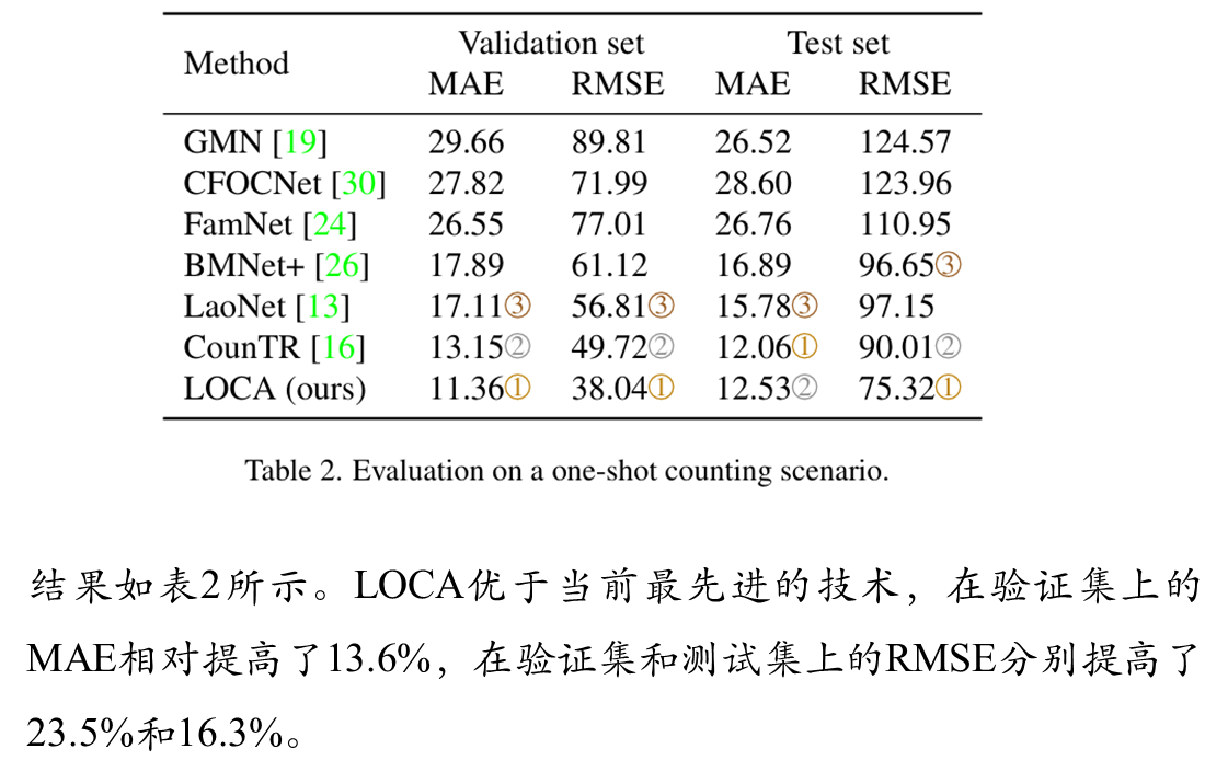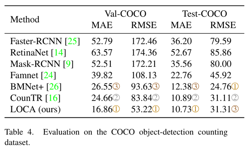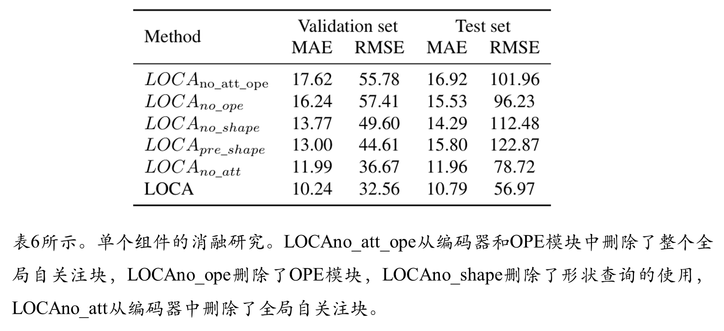 LOCA将输入图像的大小调整为H_IN = W_IN = 512像素,并应用swv[5]预训练的ResNet50骨干,将最后三个块的特征上采样到h = w = 64像素。这就产生了一个有3584个通道的激活图,通过一个1 × 1的卷积层进一步投影到d = 256个通道。全局自关注块是一个3层的变压器编码器。MHA模块由8个注意头组成,隐藏维数d = 256,而FFN的隐藏维数为1024。每个MHA和FFN模块后应用Dropout,概率为0.1。迭代自适应模块包含L = 3层,具有相同的MHA和FFN维度。对象原型空间大小为s × s, s = 3,不使用dropout。ground truth真密度图是通过在物体位置上放置单元密度并使用高斯核平滑生成的,高斯核的大小是为每个图像单独确定的。特别是,内核大小被确定为样例边界box平均大小的1/8。