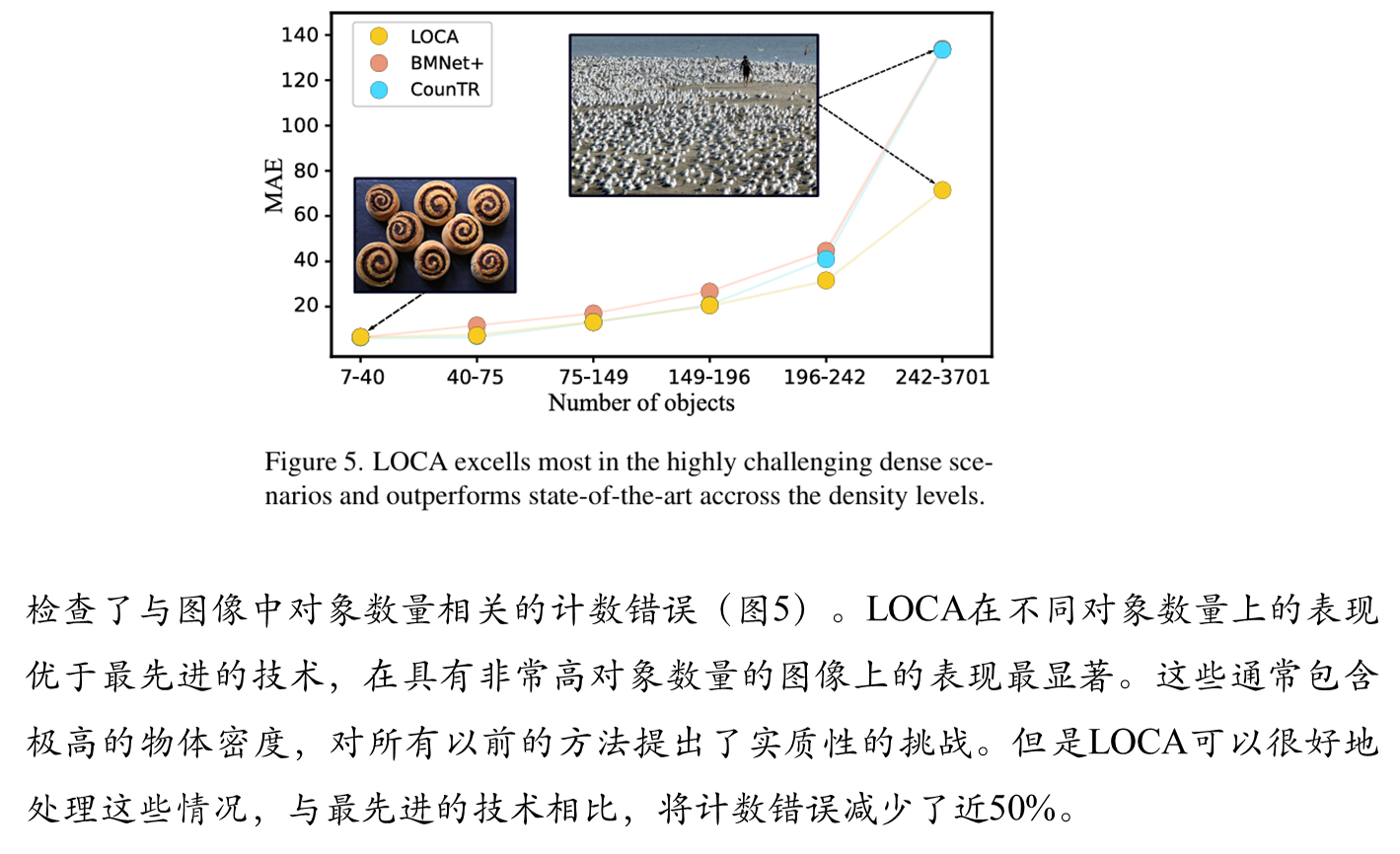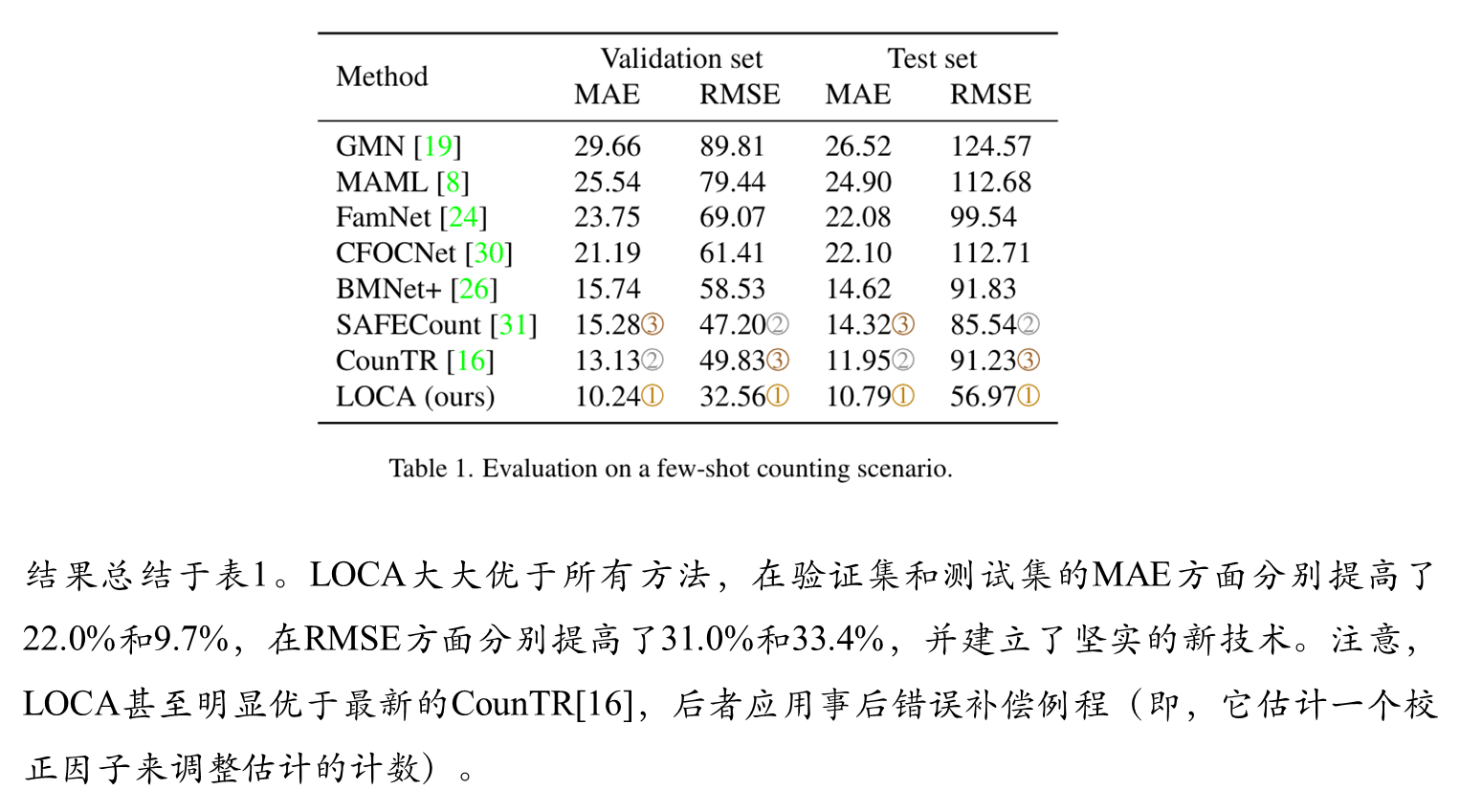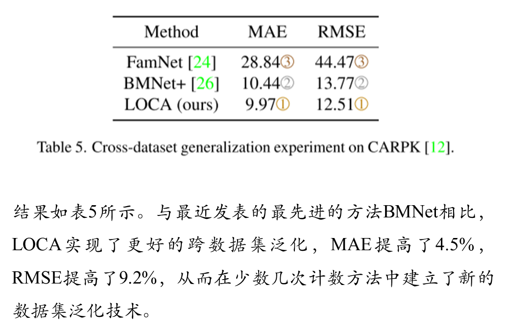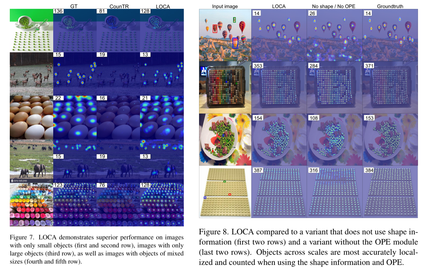 LOCA将输入图像的大小调整为H_IN = W_IN = 512像素,并应用swv[5]预训练的ResNet50骨干,将最后三个块的特征上采样到h = w = 64像素。这就产生了一个有3584个通道的激活图,通过一个1 × 1的卷积层进一步投影到d = 256个通道。全局自关注块是一个3层的变压器编码器。MHA模块由8个注意头组成,隐藏维数d = 256,而FFN的隐藏维数为1024。每个MHA和FFN模块后应用Dropout,概率为0.1。迭代自适应模块包含L = 3层,具有相同的MHA和FFN维度。对象原型空间大小为s × s, s = 3,不使用dropout。ground truth真密度图是通过在物体位置上放置单元密度并使用高斯核平滑生成的,高斯核的大小是为每个图像单独确定的。特别是,内核大小被确定为样例边界box平均大小的1/8。