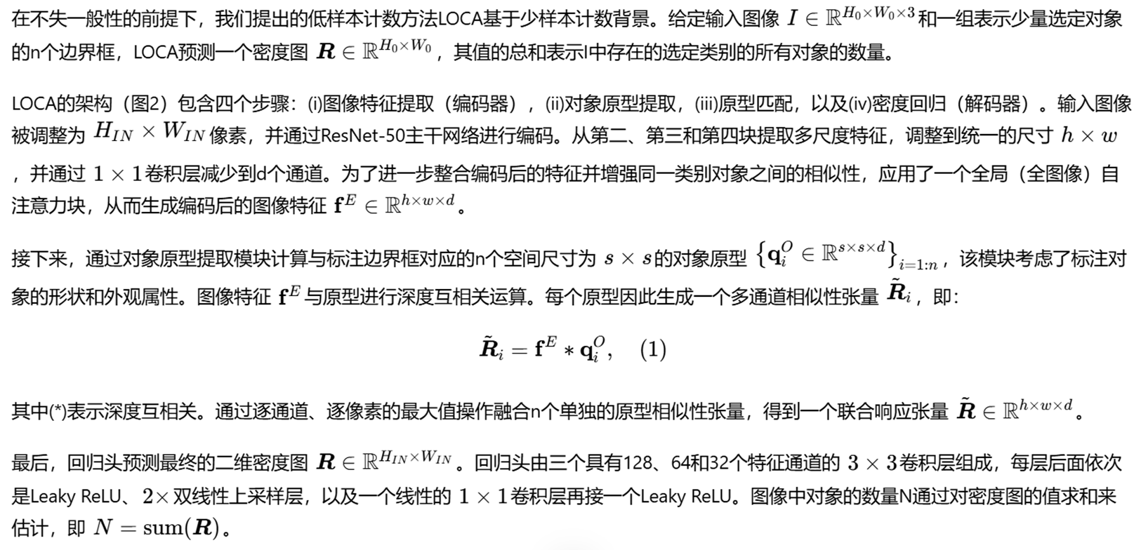 本文提出了一种低样本目标计数网络LOCA,通过迭代原型自适应方法解决现有计数算法忽略形状信息导致定位不准的问题。针对现有方法(如GMN、FamNet)通过特征池化丢失物体尺寸/长宽比信息、原型泛化能力有限等缺陷,LOCA创新性地分离处理示例的形状和外观信息。网络采用ResNet-50骨干提取特征,通过目标原型提取模块显式编码形状信息,再经深度互相关匹配生成响应图,最终回归为密度图实现计数。实验表明该方法在保持简洁架构的同时,有效提升了高密度场景和尺寸变化情况下的计数精度。论文代码已开源,为类别无关的统计算法研究提供了新思路。