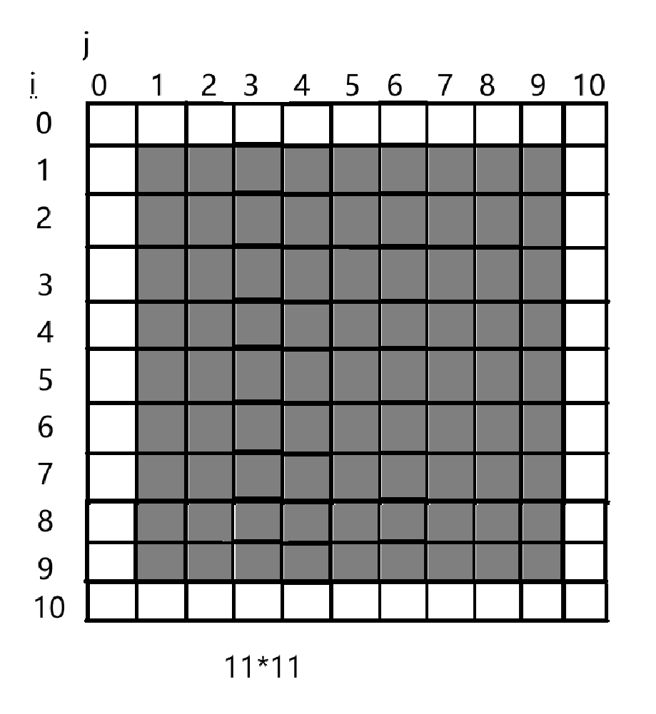如上图11*11棋盘所示,中间灰色的9*9区域为有效游戏区域,而外围一圈白色区域则是为正常实现功能而准备的空白区域,不对游戏过程及结果产生任何影响。因此我们在这个9*9的区域中可以通过随机数来设置雷(有雷的位置设为1,没有雷的位置设置为0)