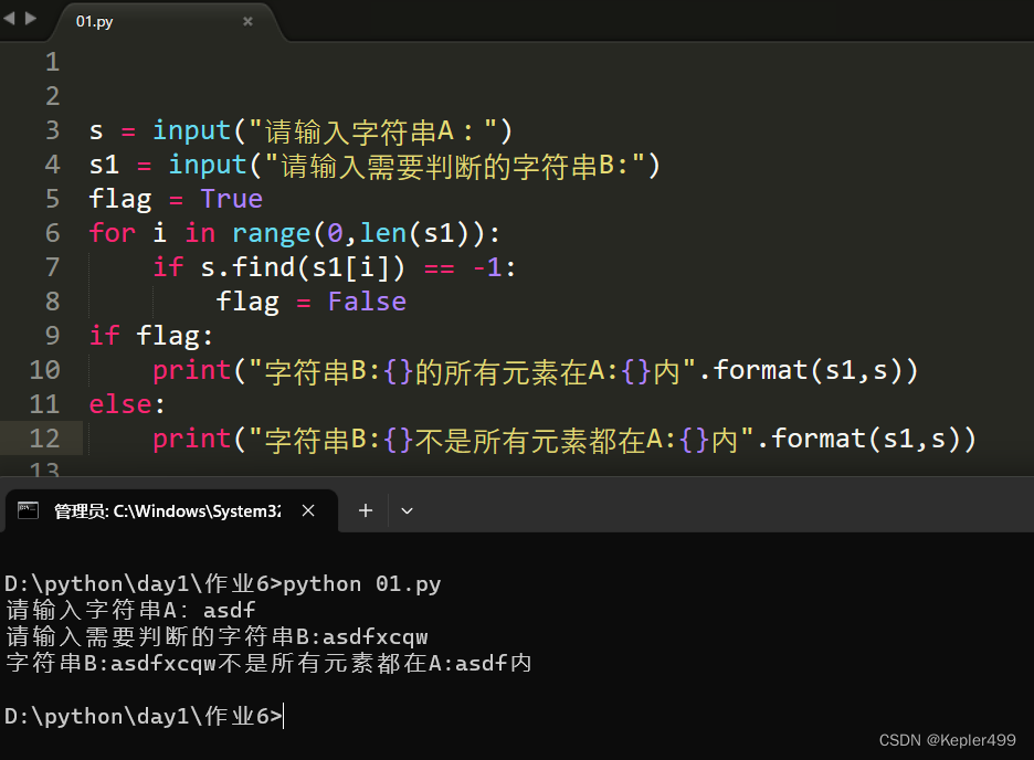 print("字符串B:{}的所有元素在A:{}内".format(s1,s))