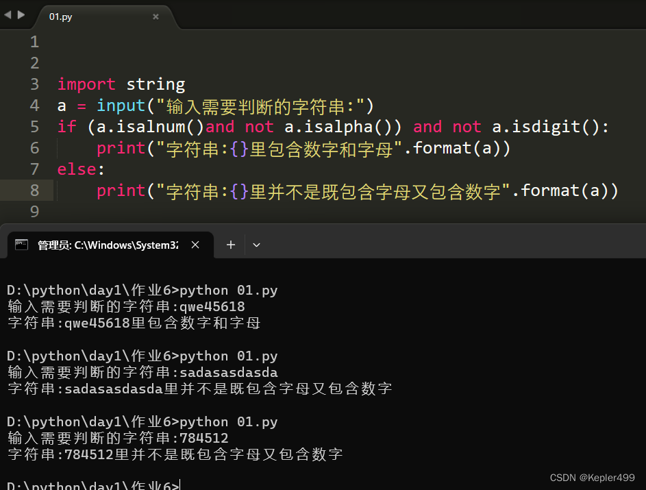 print("字符串:{}里并不是既包含字母又包含数字".format(a))