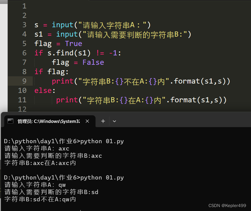 print("字符串B:{}在A:{}内".format(s1,s))