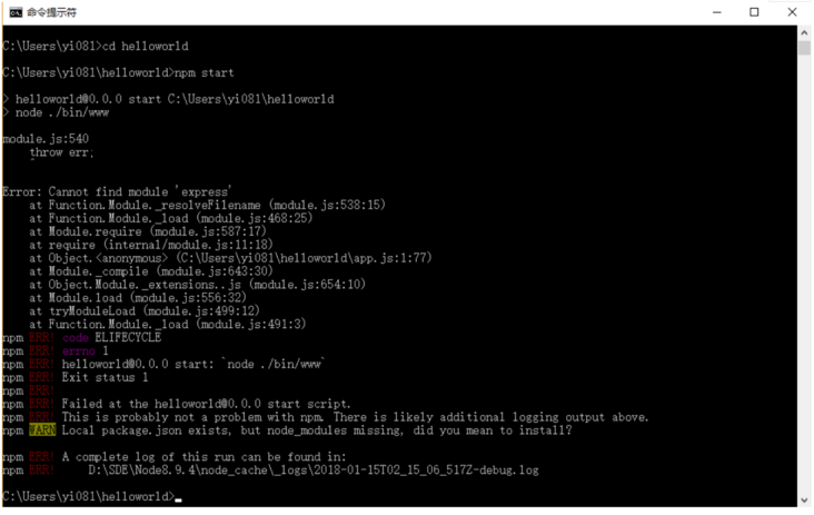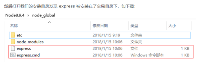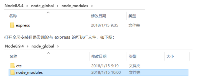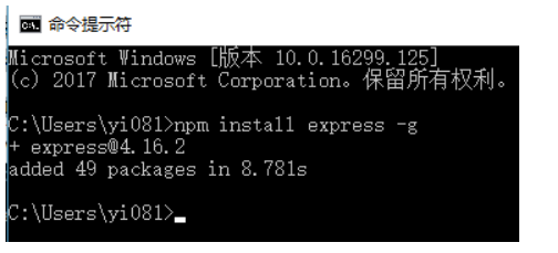 注:如果安装时不加 -g 参数,则安装的模块就会安装在当前路径下,上例若不加 -g 参数,则 express 模块会安装在 C:\Users\yi081目录下的 【node_modules】目录下,目录若不存在会自动生成。