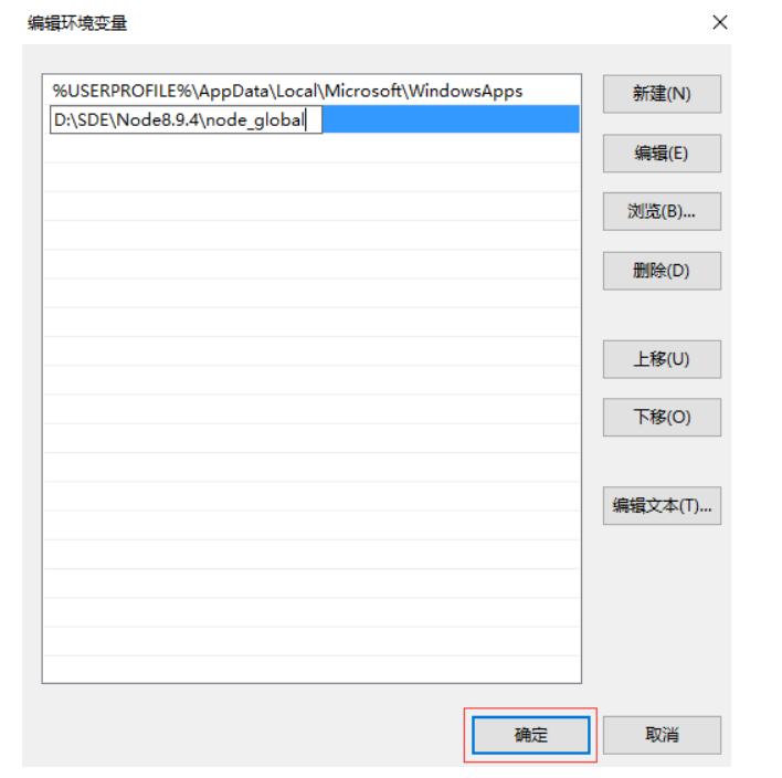 B、将【用户变量】下的【Path】修改为【D:\SDE\Node8.9.4\node_global】