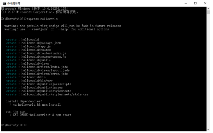 最后查阅网上资源后,原来,最新express版本中将命令工具分家出来了(项目地址:https://github.com/expressjs/generator),所以还需要安装一个命令工具,命令如下: