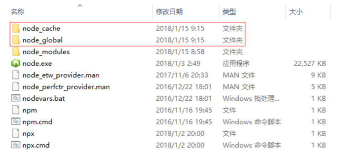 例如:我希望将全模块所在路径和缓存路径放在我node.js安装的文件夹中,则在我的安装目录下创建两个文件夹【node_global】及【node_cache】如下图: