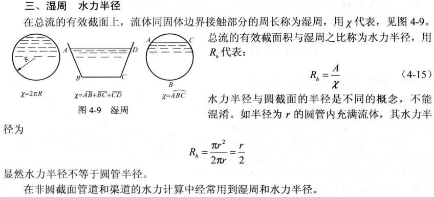 与前者看似关联实则使用场合迥异。物理来源是相同的,但是其引入的目的是为明槽流动(open-channel flow)取一个合适的特征长度。最典型的是半圆截面明槽流(或者管内流但是只有下半圆截面积有流体),显然其特征长度取为真实半径r,也即半圆明槽流的水力半径等于真实半径r。简单数学计算可得,对于半圆明槽流,其。对于其他形状的明槽流,同样定义为其特征长度,称为“水力半径”。从数学上看,对某一截面形状而言,“水力直径是水力半径的4 倍”这个关系是成立的,但是从物理意义上讲这个关系没有意义。我们不会同时计算某一种流动的水力直径和水力半径。对于管内流只用水力直径来表征,而明槽流则只用水力半径来表征。对应于上段的那个例子,假如去掉两平行板中的上面一块,则流动变成拟无限宽明槽流,其特征长度应取水力半径,近似等于水深H而不是原来的2H。