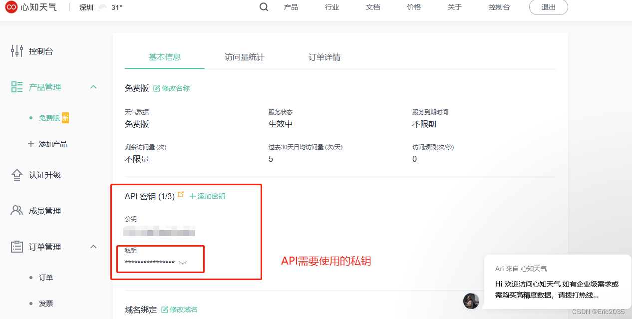 your_api_key:上一步在心知天气官网申请的私钥,需要用我们自己的私钥替换your_api_key