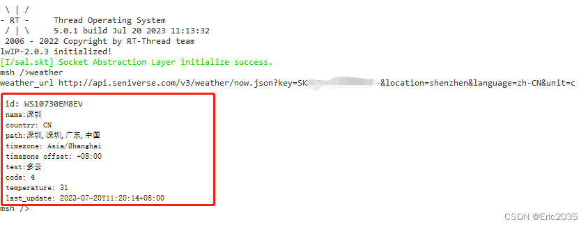 软件代码功能实现了通过心知天气API获取心知天气实时天气数据(json格式),然后通过cjson解析出天气数据通过控制台打印出来,代码运行输出结果如下图