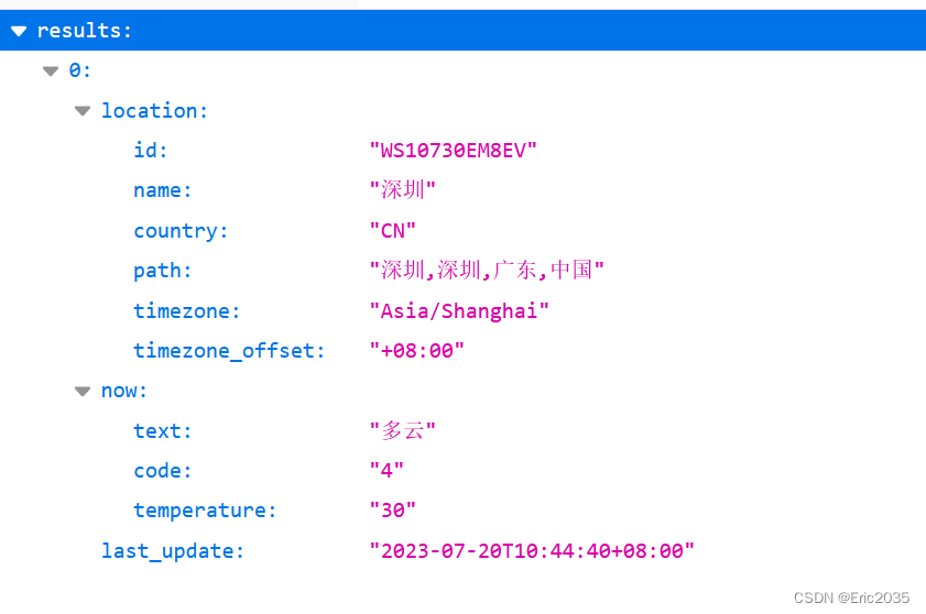 {"results":[{"location":{"id":"WS10730EM8EV","name":"深圳","country":"CN","path":"深圳,深圳,广东,中国","timezone":"Asia/Shanghai","timezone_offset":"+08:00"},"now":{"text":"多云","code":"4","temperature":"30"},"last_update":"2023-07-20T10:44:40+08:00"}]}