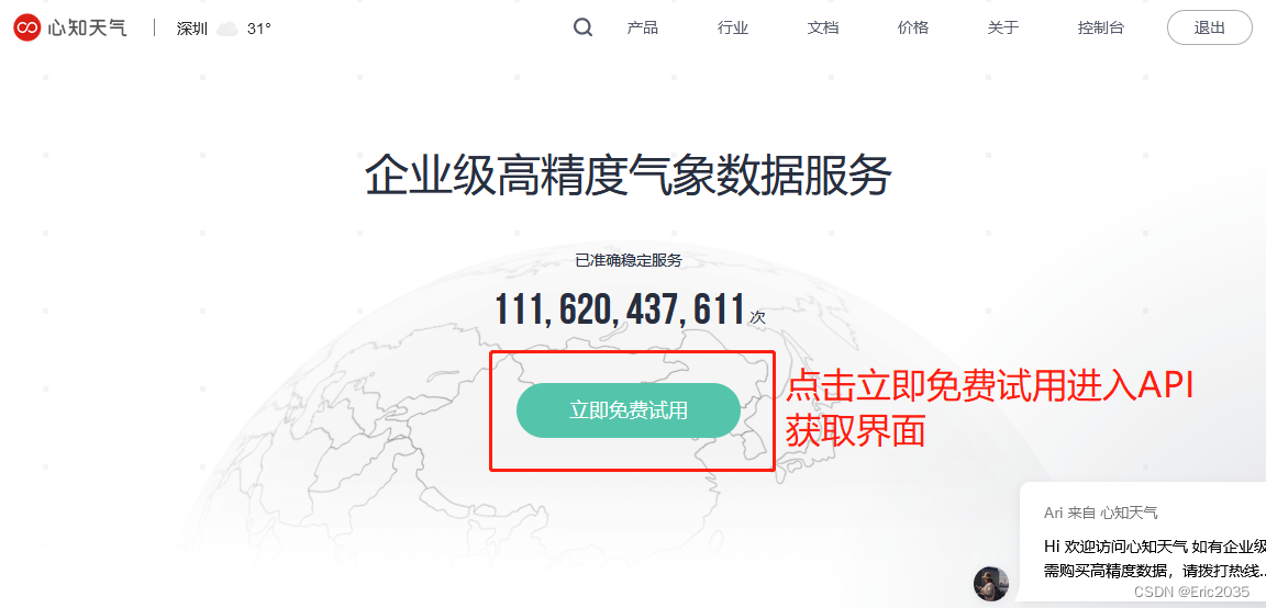 1、打开网站,点击立即免费试用按钮进入API获取界面,如下图: