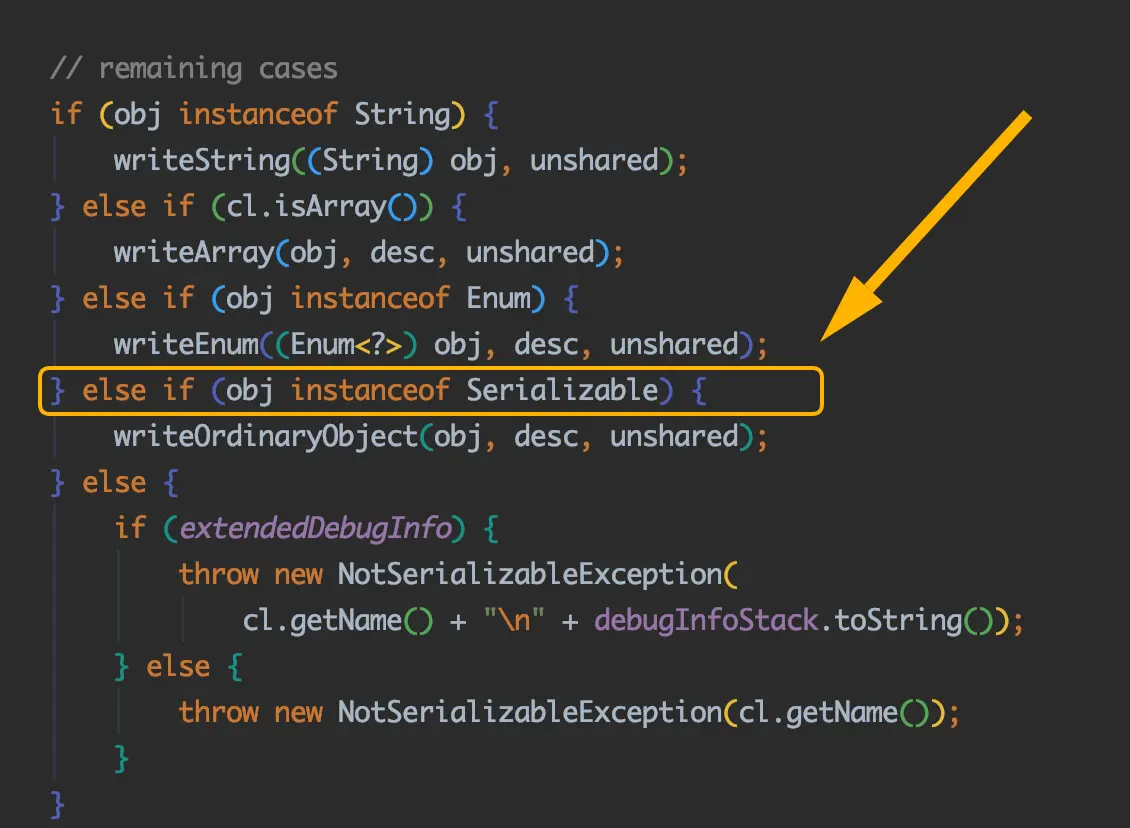 2. 既未实现字符串、数组、枚举、也未实现Serialize接口,则:抛出NotSerilazableException异常。